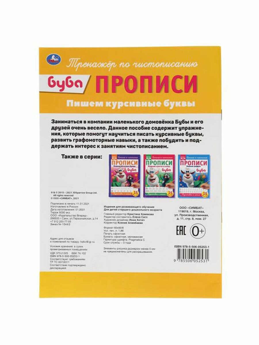 Ребёнок будет рад повстречаться на страницах этой занимательной раскраски с героем любимого мультсериала. Он с удовольствием будет раскрашивать красивые картинки с чётким контуром, а также тренироваться в написании курсивных букв, повторяя при этом алфавит. Для достижения эффективных результатов достаточно заниматься с детьми по 15 минут в день - главное, поддерживать их интерес и хвалить за успехи. Прописи «Буба. Пишем курсивные буквы» - это настоящий тренажёр по чистописанию: - подготовка к школе, - интересные иллюстрации с любимым персонажем, - повторяем азбуку, - учимся писать курсивные буквы, - соответствует ФГОС. Рекомендовано детям старшего дошкольного возраста.