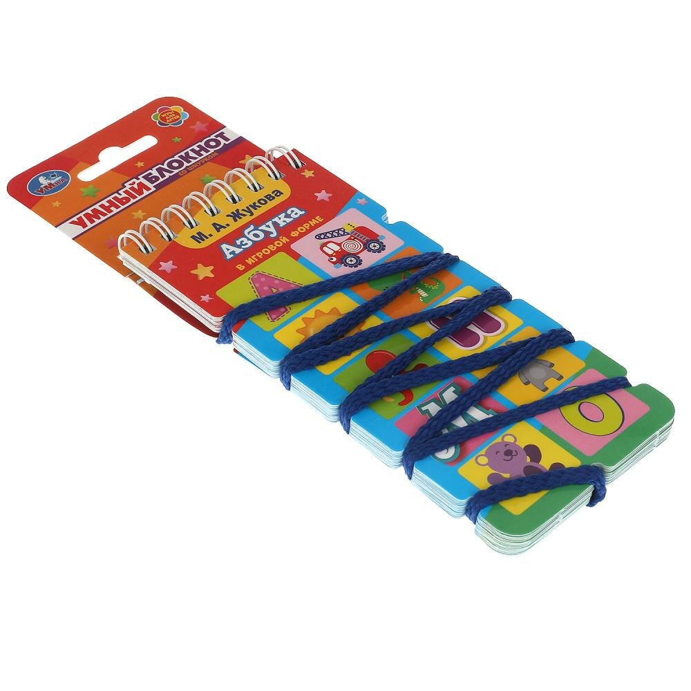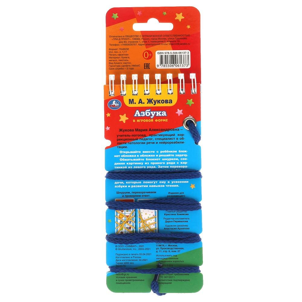 Умный блокнот со шнурком «М. А. Жукова. Азбука в игровой форме» ТМ «УМка» непременно понравится маленьким любознайкам:- учим буквы- интересный формат: шнуруем, переворачиваем и проверяем ответ- увлекательно и познавательно- занимательные заданияДанный блокнот содержит задания по авторской методике Марии Александровны Жуковой - учителя-логопеда, практикующего коррекционного педагога, специалиста в области патологии речи и нейрореабилитации. Суть занятия: блокнот открывается обложка к обложке, ребёнок вместе с родителями решает задачу, соединяя с помощью шнурка картинку из правого ряда с картинкой из левого ряда. Ответ можно проверить, перевернув блокнот: если узор шнурка совпадает с нарисованным узором на страничке, значит задача решена верно. Такие увлекательные игровые задания помогут дошкольнику в усвоении азбуки и развитии навыков чтения.Занятия с блокнотом ТМ «УМка» также способствуют развитию:- мелкой моторики рук- памяти- внимания- логики- усидчивостиОбъём: 32 стр. Формат: 70 х 155 мм.Материал: офсетная бумага + картон + металл + текстиль.Рекомендовано детям старшего дошкольного возраста.