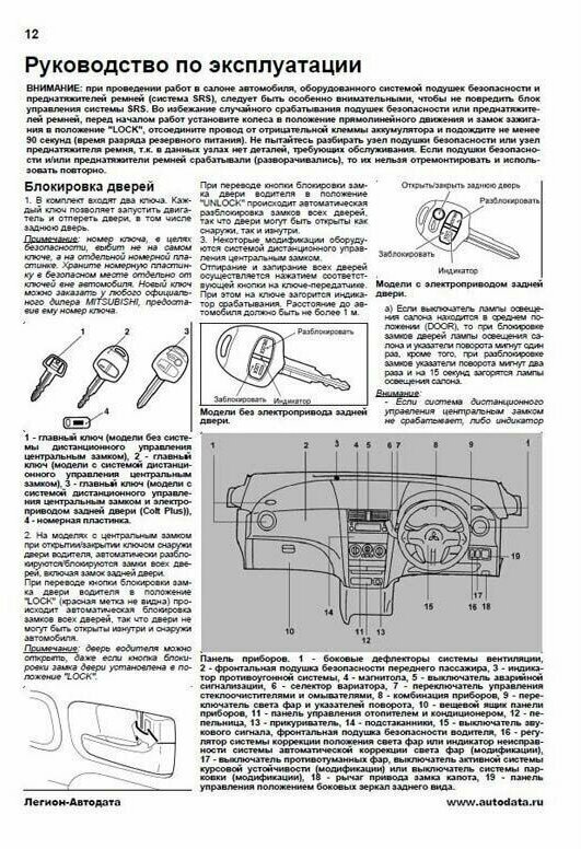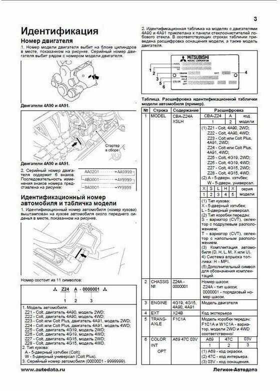 В руководстве дается пошаговое описание процедур по эксплуатации, ремонту и техническому обслуживанию праворульных переднеприводных и полноприводных автомобилей Mitsubishi Colt / Colt Plus с 2002 года выпуска, оборудованных бензиновыми двигателями 4G19 (1,3 л), 4А90 (1,3 л), 4G15 (1,5 л) и 4А91 (1,5 л). Издание содержит руководство по эксплуатации, подробные сведения по техническому обслуживанию автомобиля и диагностике, ремонту и регулировке систем двигателя (в т.ч. системы впрыска топлива (MPI), системы изменения фаз газораспределения (MIVEC), зажигания, запуска и зарядки), рекомендации по регулировке и ремонту вариатора, заднего моста (4WD), элементов тормозной системы (включая антиблокировочную систему тормозов (ABS), электронную систему распределения тормозных усилий (EBD), систему курсовой устойчивости (ASC)), рулевого управления и подвески. Приведены инструкции по использованию самодиагностики системы управления двигателем, вариатором, электроусилителем рулевого.