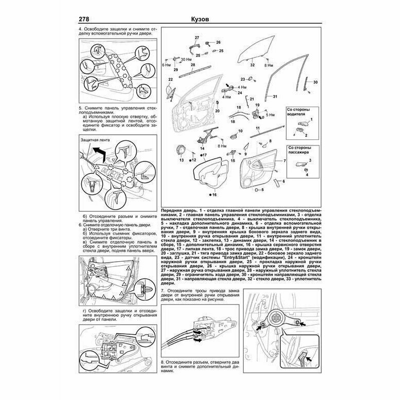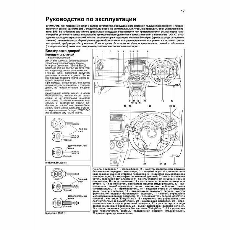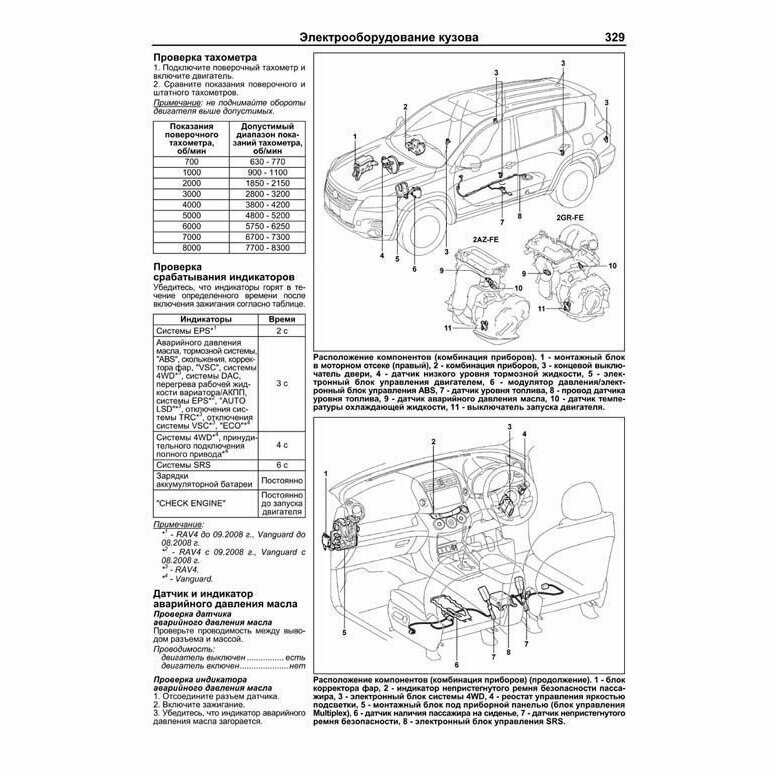 общие характеристики:Марка и модель: Toyota RAV4, Toyota Vanguard;Тип: Эксплуатация (ремонт и обслуживание);Двигатель: 2AZ-FE,2GR-FE;Объем двигателя: 2.4,3.5;Переплет: Мягкий;Модельный год: 2005-2013;Страниц: 464;Формат: А4;ISBN: 978-5-88850-569-4;Издательство: легион-автодата;Руководство по эксплуатации, техническому обслуживанию и ремонту Toyota RAV4, Toyota Vanguard с бензиновым двигателем (2005-2013 гг.)Издание содержит руководство по эксплуатации, подробные сведения по техническому обслуживанию автомобиля, диагностике, ремонту и регулировке некоторых элементов систем двигателя (в т. ч. систем управления двигателем, изменения фаз газораспределения (VVT), зажигания, запуска и зарядки), вариатора (CVT), автоматической коробки передач (АКПП), раздаточной коробки, заднего редуктора (в т. ч. системы автоматического включения полного привода (4WD)), элементов тормозной системы (включая антиблокировочную систему тормозов (ABS), систему экстренного торможения (ВА), противобуксовочную систему (А-TRC) и систему курсовой устойчивости (VSC)), рулевого управления (включая электроусилитель (EPS)), подвески (включая систему контроля за давлением в шинах), кузовных элементов, системы кондиционирования и вентиляции (АС).• Приведены инструкции по диагностике и диагностические коды 18 электронных систем: управления двигателем, АКПП, CVT, 4WD, ABS, VSC, АС, SRS, EPS, блокировки рулевого управления, Entry&Start, комбинации приборов, наружного освещения, электроприводов стеклоподъемников, электропривода люка крыши, камеры заднего обзора, иммобилайзера, поддержания скорости (Сruise Сontrol);• Подробно описаны 400 кодов неисправностей P0, P1, Р2, C0, С1, В1 В2, U0 и возможные места их возникновения;• Представлены 109 основных электросхем (75 систем) для различных вариантов комплектации, описание элементов электрооборудования;• Приведены возможные неисправности и методы их устранения, сопрягаемые размеры основных деталей и пределы их допустимого износа, рекомендуемые смазочные материалы и рабочие жидкости, каталожные номера необходимых для технического обслуживания, размеры рекомендуемых и допускаемых шин и дисков;Представленные характерные неисправности автомобилей RAV4 / Vanguard и способы их устранения помогут вам при эксплуатации автомобиля.Книга предназначена для автовладельцев, персонала СТО и ремонтных мастерских.