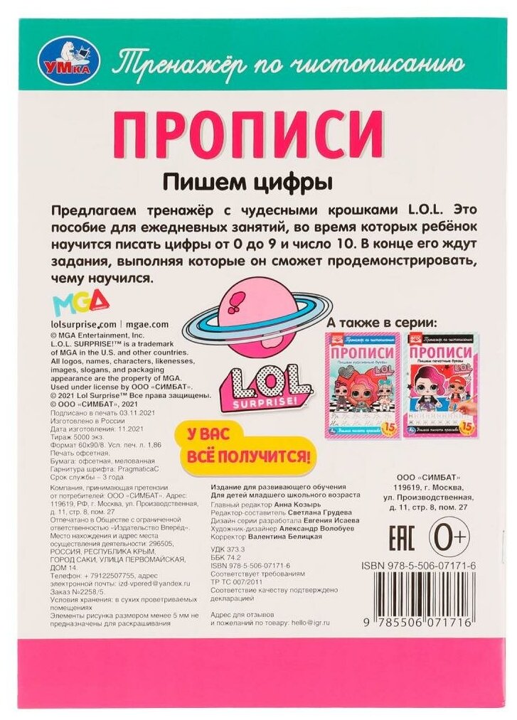 На сегодняшний день товар «Книга: Прописи Умка Пишем цифры. Тренажёр по чистописанию ЛОЛ (без автора), 2021» можно купить с кешбеком в 1 магазине: Яндекс.Маркет