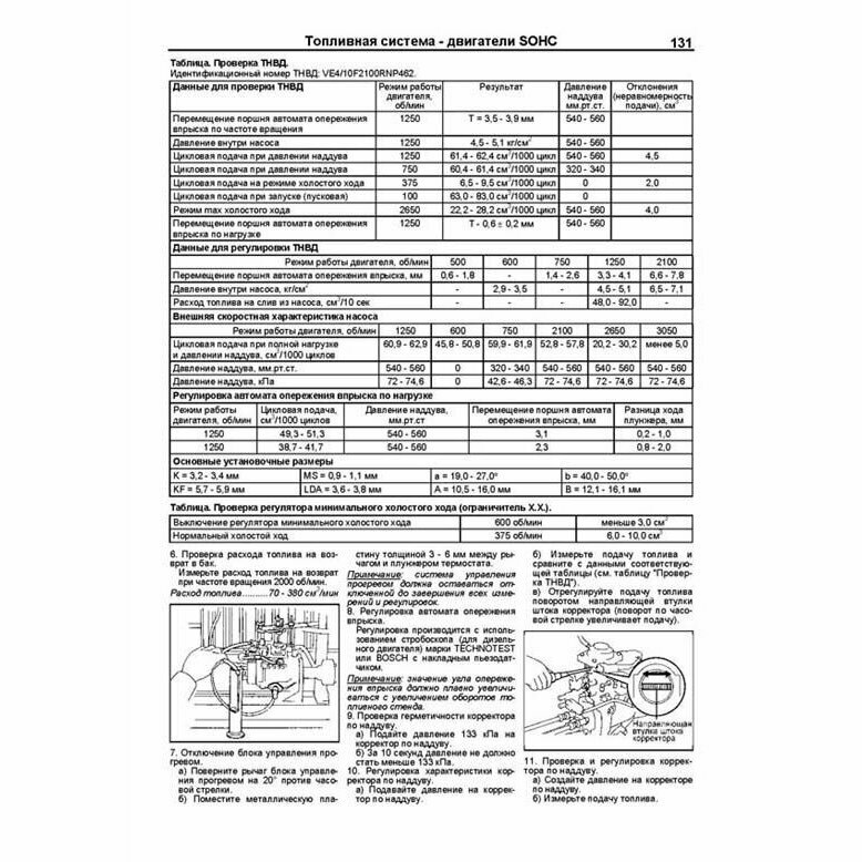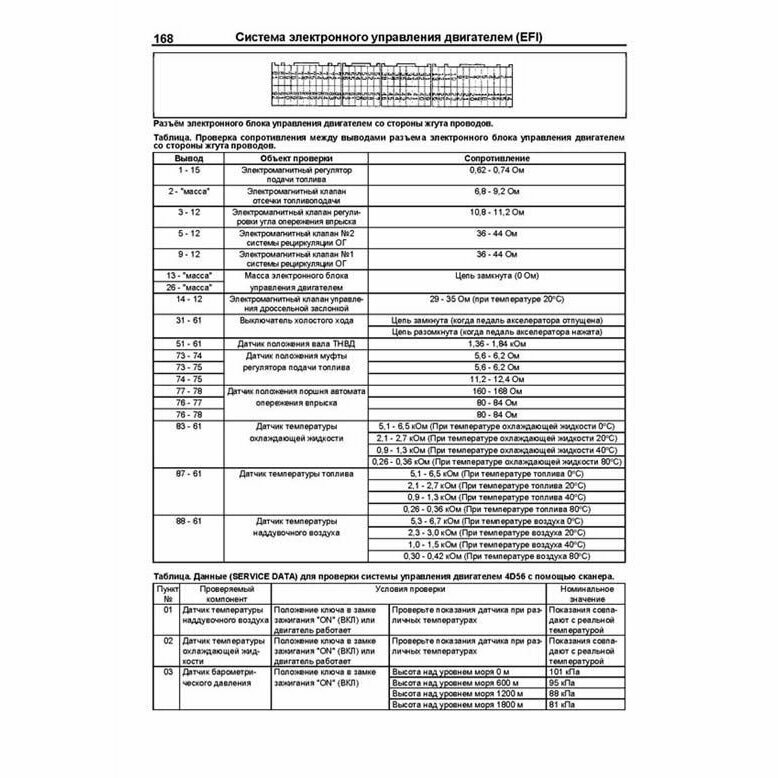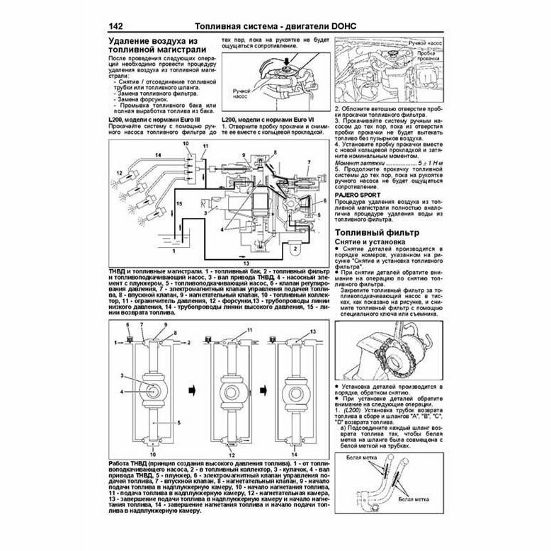 Издание содержит подробные сведения по техническому обслуживанию двигателей, ремонту и регулировке механических частей двигателей (SOHC и DOHC), смазки, охлаждения, турбонаддува, рециркуляции отработавших газов (EGR), запуска и зарядки. В книге подробно рассмотрены процедуры по диагностике, ремонту и регулировке ТНВД распределительного типа (без электронного управления, с электронным управлением (EFI, COVEC-F)). Отдельная глава посвящена процедурам ремонта и диагностики двигателей с системой Common Rail (4D56 DI-D). Приведены инструкции по диагностике электронных систем управления дизельными двигателями для различных модификаций двигателей и автомобилей. Подробно описаны коды неисправностей Flash, Р0, Р1, Р2, U1, условия и возможные причины их возникновения. Приведены разъемы и процедуры проверки сигналов на выводах блоков управления для различных модификаций двигателей - PinData. Представлены электросхемы систем управления двигателем, запуска и зарядки.