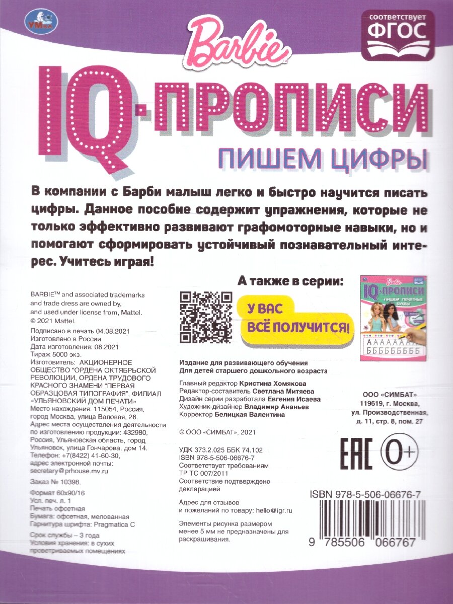 Книга Пишем цифры. IQ-прописи. Прописи. Барби. 145х195 мм. 16 стр. 1+1. Умка в кор.50шт (без автора), 2021