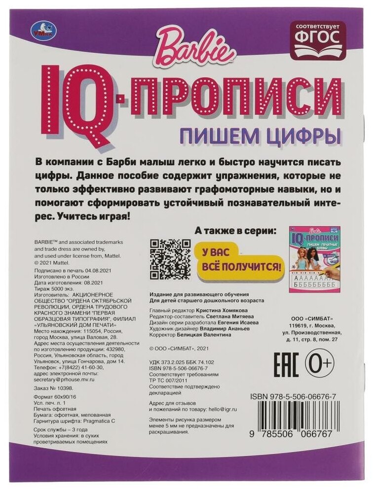 IQ-прописи «Барби. Пишем цифры» ТМ «УМка» - отличный вариант для маленькой любознайки потренироваться в чистописании:- соответствует ФГОС- учимся писать цифры- интересные иллюстрации для раскрашивания- любимые персонажи- удобный форматРебёнок будет рад повстречаться на страницах этой занимательной книжки с любимыми куклами Барби. В такой компании малышка с удовольствием будет тренироваться в написании цифр, а также раскрашивать красивые картинки с чётким контуром. Для достижения эффективных результатов в чистописании достаточно заниматься с детьми по 15 минут в день - главное, поддерживать их интерес и хвалить за успехи.Игровые занятия с раскраской-прописями ТМ «УМка» помогают подготовить руку к письму и способствуют развитию:- мелкой моторики рук- памяти- внимания- творческого мышления- усидчивостиОбъём: 16 стр. Формат: 145 х 195 мм.Материал: офсетная бумага.Рекомендовано детям старшего дошкольного возраста.
