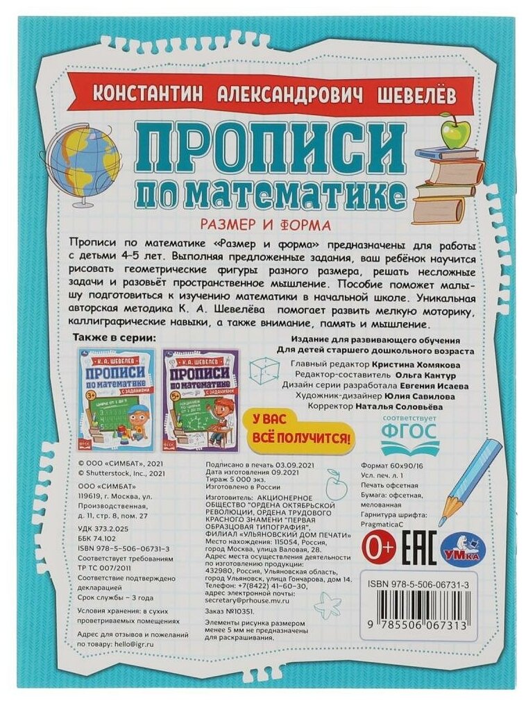 Книга Размер и форма. К.А.Шевелёв. Прописи по математике с заданиями. 145х195 мм 16 стр. (Шевелев Константин Александрович), 2021