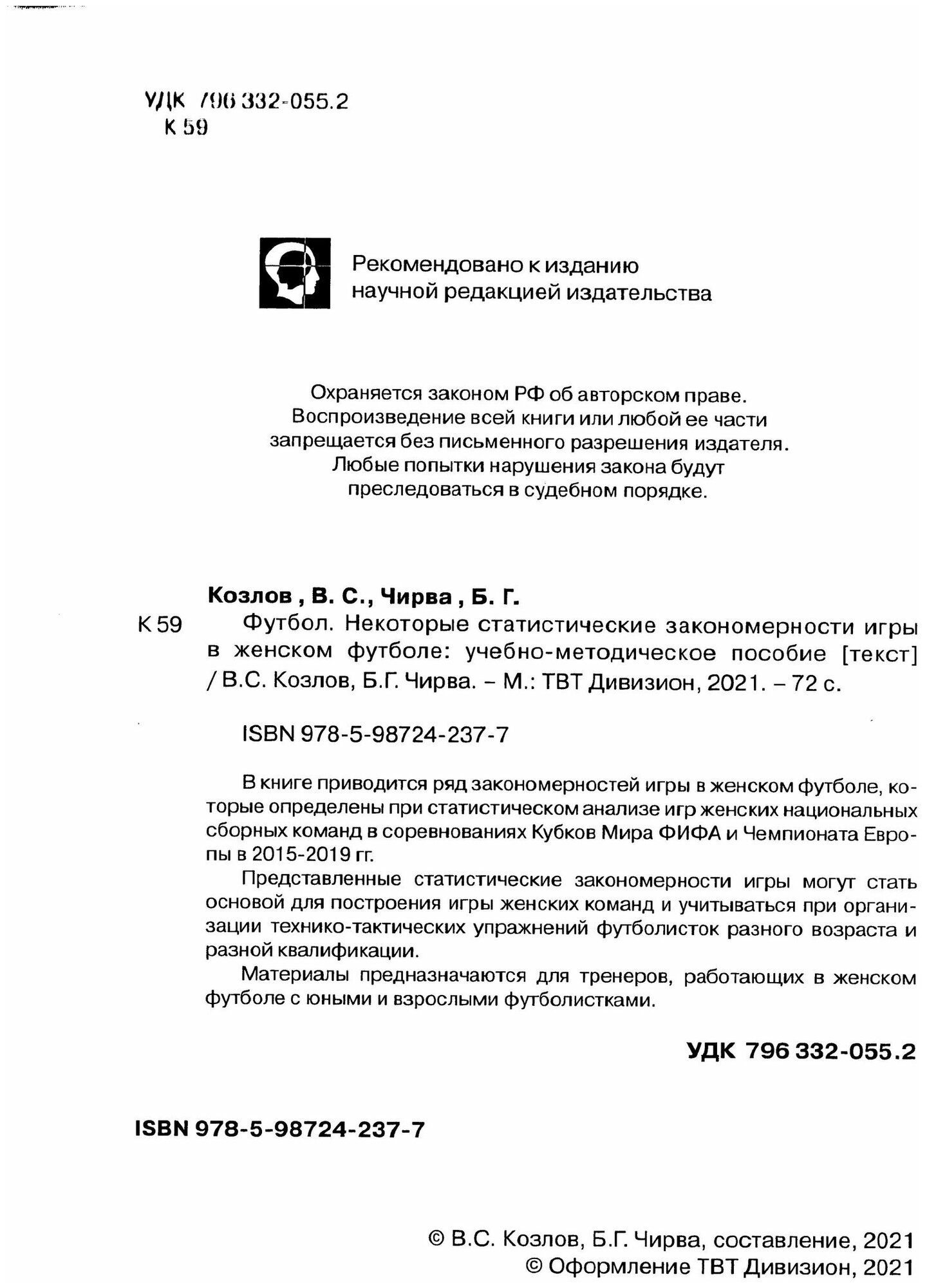 Книга Футбол. Некоторые статистические закономерности игры в женском футболе (Козлов Вадим Сергеевич; Чирва Борис Григорьевич), 2021