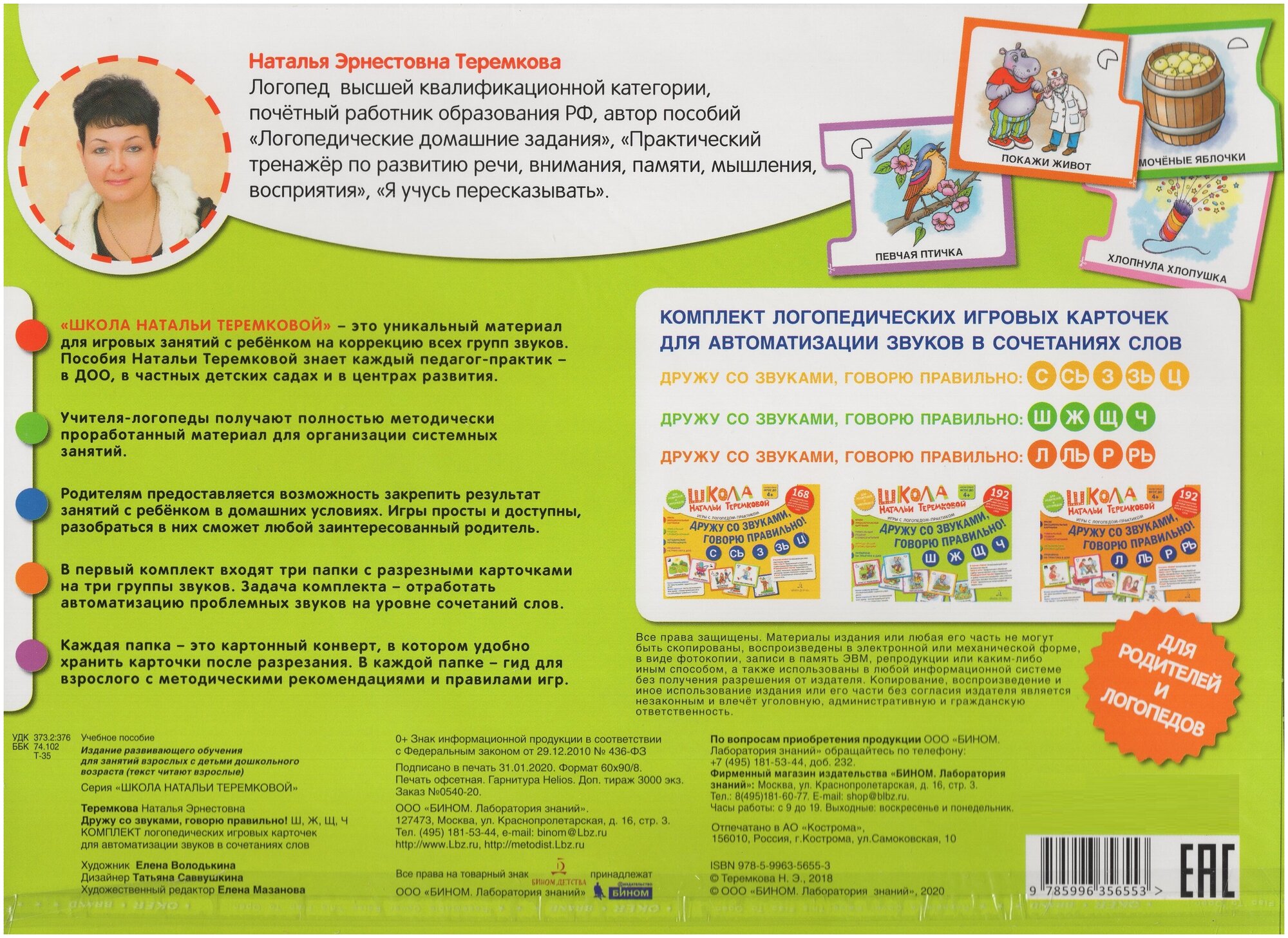 Пособия Натальи Теремковой знает каждый педагог-практик как в системе ДОО, так и в частных детских садах и центрах развития. Ее авторитет высок и среди родителей. Работает в детском саду Брянска, все ее разработки - результат постоянной творческой работы с детьми.Новый проект "Школа Натальи Теремковой" не только обобщает все наработки автора в области логопедии, но и дает новый уникальный материал для организации игровых занятий с ребенком на коррекцию всех групп звуков на всех уровнях.Логопедам, педагогам-дефектологам предлагается уникальный материал с методическими рекомендациями для организации системных занятий; родителям предоставляется возможность закрепить результат занятий в домашних условиях и даже поиграть в карточки самостоятельно.Игры настолько просты и доступны, что не смогут нанести вреда даже если в них поиграет с ребёнком не специалист, а просто мама.Первый комплект поможет отработать автоматизацию проблемных звуки на уровне словосочетаний. Три группы звуков - три папки с разрезными карточками (160, 160,192). Папка представляет собой удобный конверт для хранения, карточки после разрезания больших листов не потеряются. В каждой папке - гид для взрослого с методическими рекомендациями и правилами игр.