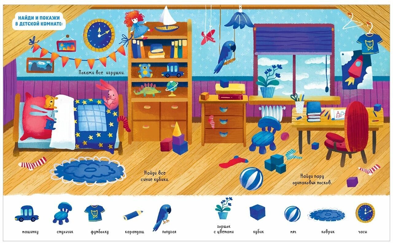 Открыв картинку с детской комнатой, например, малышу предстоит познакомиться с синим цветом и выполнить несколько заданий: найти все синие кубики и пару одинаковых носков или сосчитать все игрушки. При этом каждая панорама дает возможность поиграть в любимую игру малышей «найди и покажи»: обнаружьте все 10 указанных внизу страницы предметов на картинке выше.