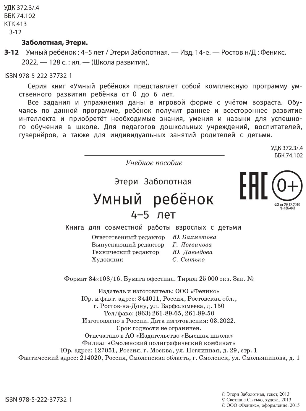 Книга Умный ребенок: 4-5 лет. 14-е изд (Этери Николаевна Заболотная); Феникс, 2024