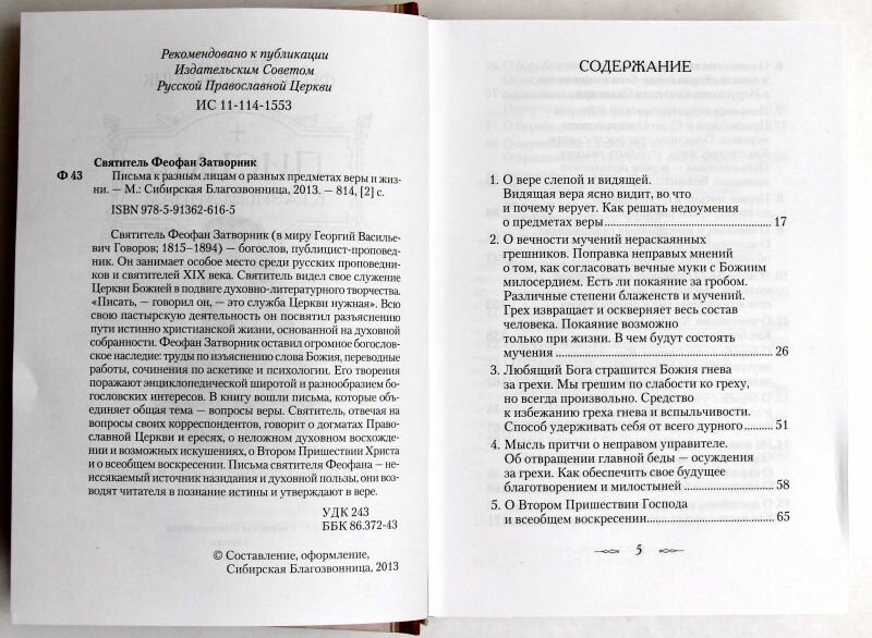 Святитель Феофан Затворник (в миру Георгий Васильевич Говоров; 1815-1894) - богослов, публицист-проповедник. Он занимает особое место среди русских проповедников и святителей XIX века. Святитель видел свое служение Церкви Божией в подвиге духовно-литературного творчества. "Писать, - говорил он, - это служба Церкви нужная". Всю свою пастырскую деятельность он посвятил разъяснению пути истинно христианской жизни, основанной на духовной собранности. Феофан Затворник оставил огромное богословское наследие: труды по изъяснению слова Божия, переводные работы, сочинения по аскетике и психологии. Его творения поражают энциклопедической широтой и разнообразием богословских интересов. В книгу вошли письма, которые объединяет общая тема - вопросы веры. Святитель, отвечая на вопросы своих корреспондентов, говорит о догматах Православной Церкви и ересях, о неложном духовном восхождении и возможных искушениях, о Втором Пришествии Христа и о всеобщем воскресении. Письма святителя Феофана - неиссякаемый источник назидания и духовной пользы, они возводят читателя в познание истины и утверждают в вере.