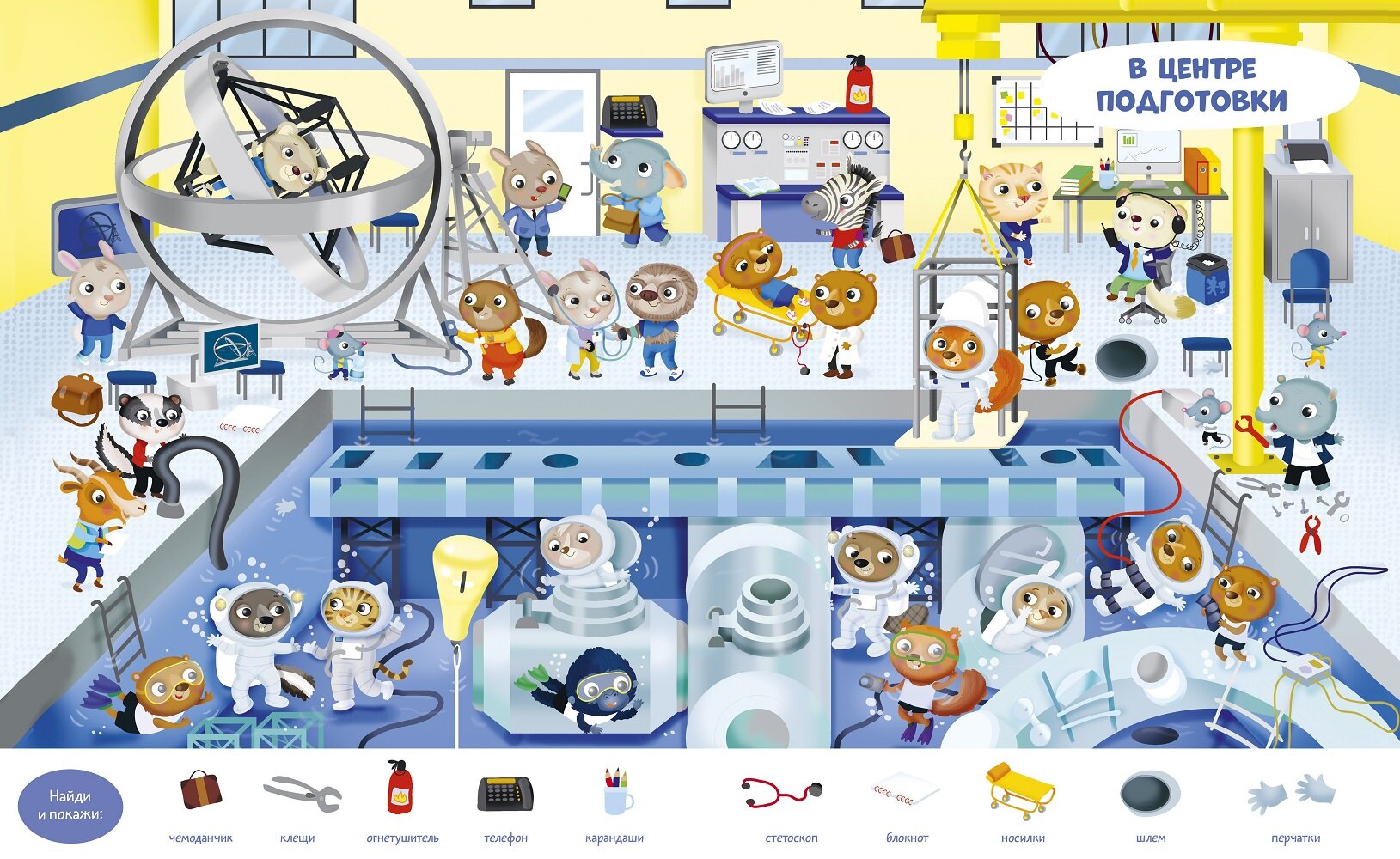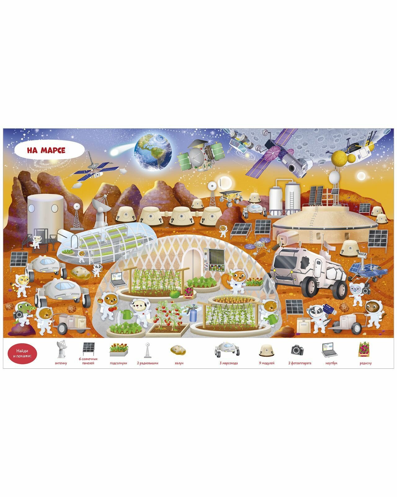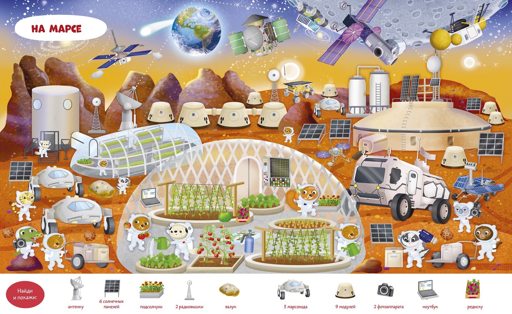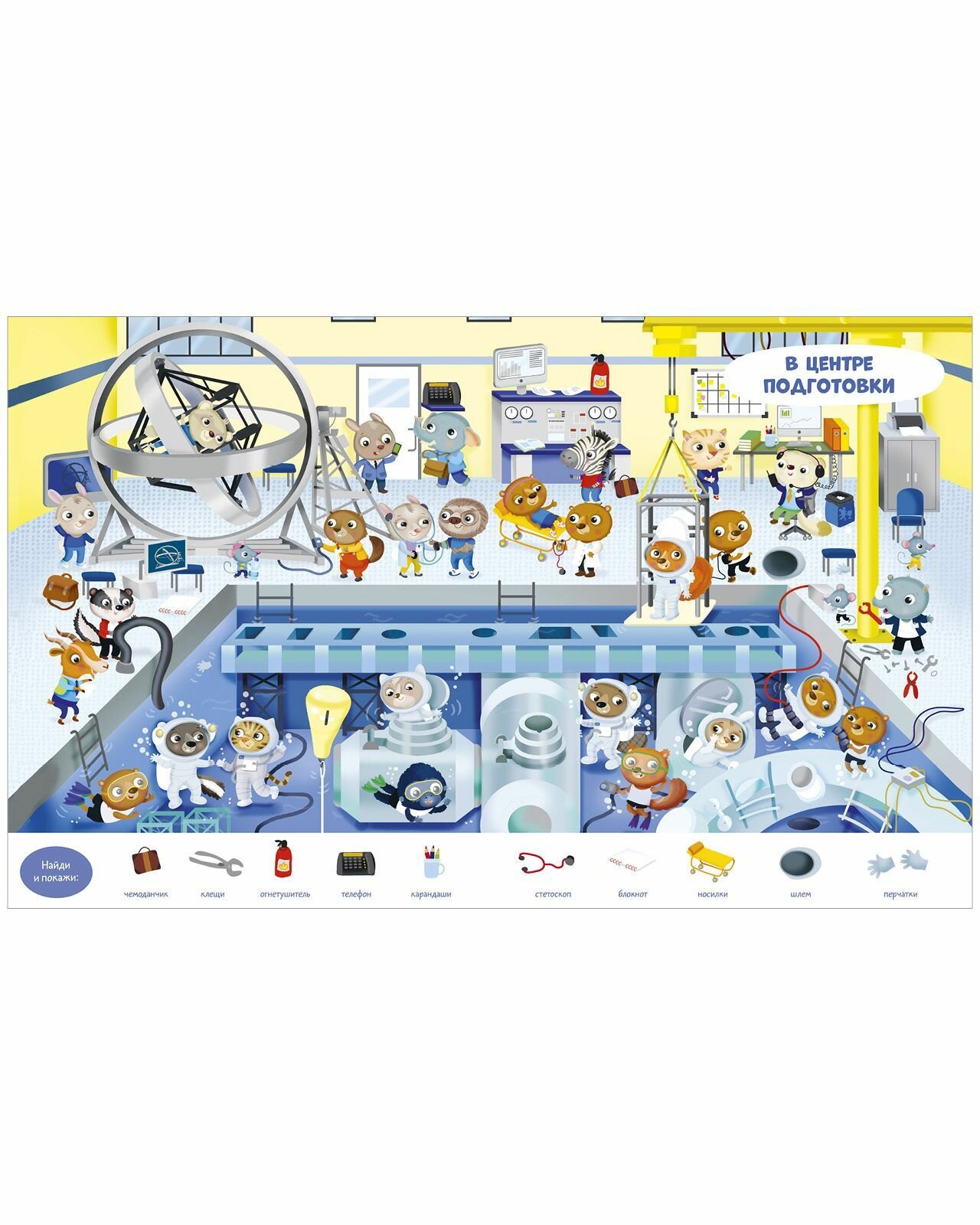 Вашего ребенка ждут девять сюжетных разворотов для игры в «найди и покажи», три большие раскраски и панорамная иллюстрация для аппликации из наклеек. Забавные сюжеты, яркие предметы и милые герои надолго увлекут непоседу.