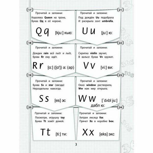 Сборник «365+5 заданий по английскому языку» представляет собой подборку упражнений для дошкольников и учащихся начальной школы. Эти упражнения в игровой форме знакомят детей с буквами английского алфавита и цифрами, а также развивают логическое мышление, умение пользоваться полученными знаниями, любознательность и память. Если ребёнок пытлив и любознателен, то выполнение одного упражнения в день позволит ему за 365 дней в году познакомиться с буквами английского языка и цифрами, научиться составлять английские слова и считать.