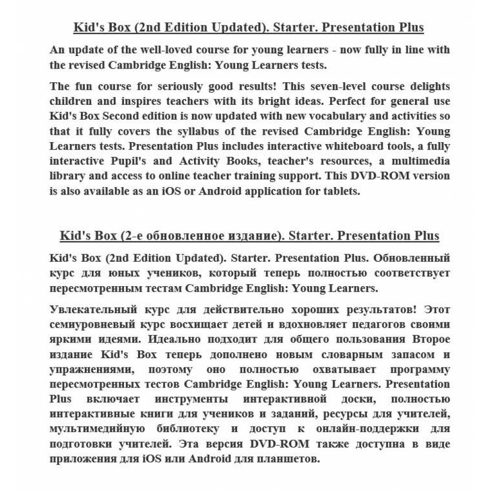Kid's Box (2nd Edition Updated). Starter. Presentation Plus An update of the well-loved course for young learners - now fully in line with the revised Cambridge English: Young Learners tests. The fun course for seriously good results! This seven-level course delights children and inspires teachers with its bright ideas. Perfect for general use Kid's Box Second edition is now updated with new vocabulary and activities so that it fully covers the syllabus of the revised Cambridge English: Young Learners tests. Presentation Plus includes interactive whiteboard tools, a fully interactive Pupil's and Activity Books, teacher's resources, a multimedia library and access to online teacher training support. This DVD-ROM version is also available as an iOS or Android application for tablets. Kid's Box (2-е обновленное издание). Starter. Presentation Plus Kid's Box (2nd Edition Updated). Starter. Presentation Plus. Обновленный курс для юных учеников, который теперь полностью соответствует пересмотренным тестам Cambridge English: Young Learners. Увлекательный курс для действительно хороших результатов! Этот семиуровневый курс восхищает детей и вдохновляет педагогов своими яркими идеями. Идеально подходит для общего пользования Второе издание Kid's Box теперь дополнено новым словарным запасом и упражнениями, поэтому оно полностью охватывает программу пересмотренных тестов Cambridge English: Young Learners. Presentation Plus включает инструменты интерактивной доски, полностью интерактивные книги для учеников и заданий, ресурсы для учителей, мультимедийную библиотеку и доступ к онлайн-поддержки для подготовки учителей. Эта версия DVD-ROM также доступна в виде приложения для iOS или Android для планшетов.