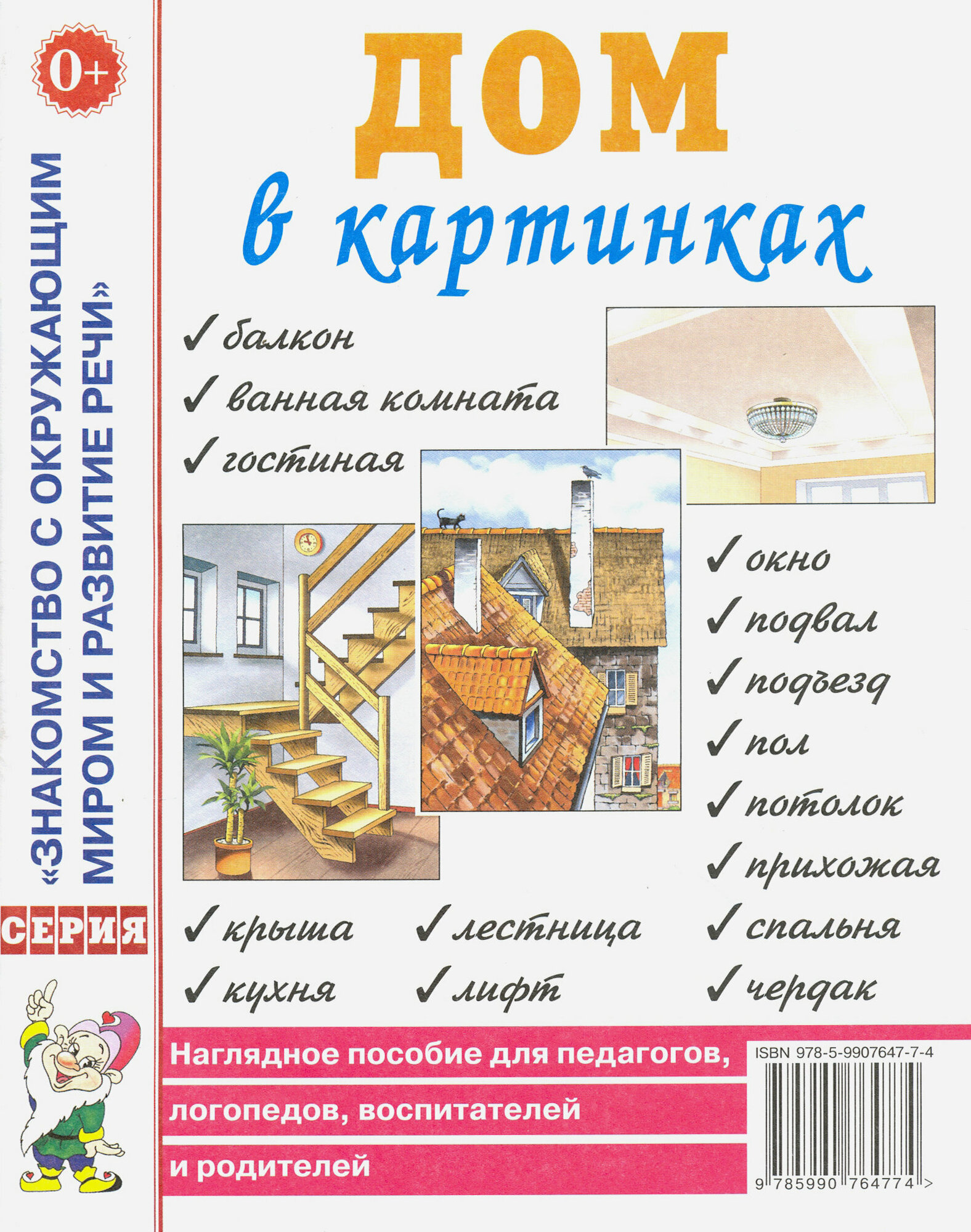 Дом в картинках. Наглядное пособие для педагогов, логопедов, воспитателей и родителей. Издание для занятий взрослых с детьми дошкольного возраста (наглядное пособие). В выпуске: Балкон Ванная комната Гостиная Крыша Кухня Лестница Лифт Подвал Подъезд Пол Потолок Прихожая Спальня Чердак Окно.