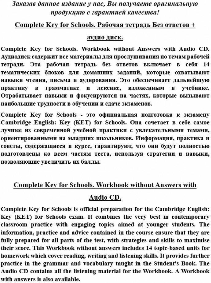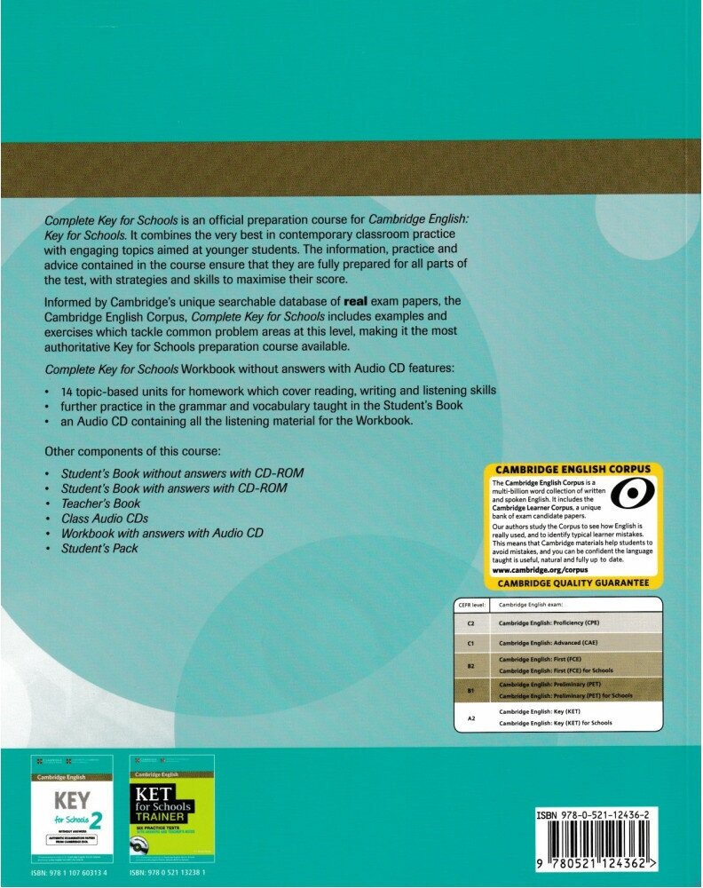 Complete Key for Schools is official preparation for the Cambridge English: Key (KET) for Schools exam. It combines the very best in contemporary classroom practice with engaging topics aimed at younger students. The information, practice and advice contained in the course ensure that they are fully prepared for all parts of the test, with strategies and skills to maximise their score. This Workbook without answers includes 14 topic-based units for homework which cover reading, writing and listening skills. It provides further practice in the grammar and vocabulary taught in the Student"s Book. The Audio CD contains all the listening material for the Workbook. A Workbook with answers is also available.