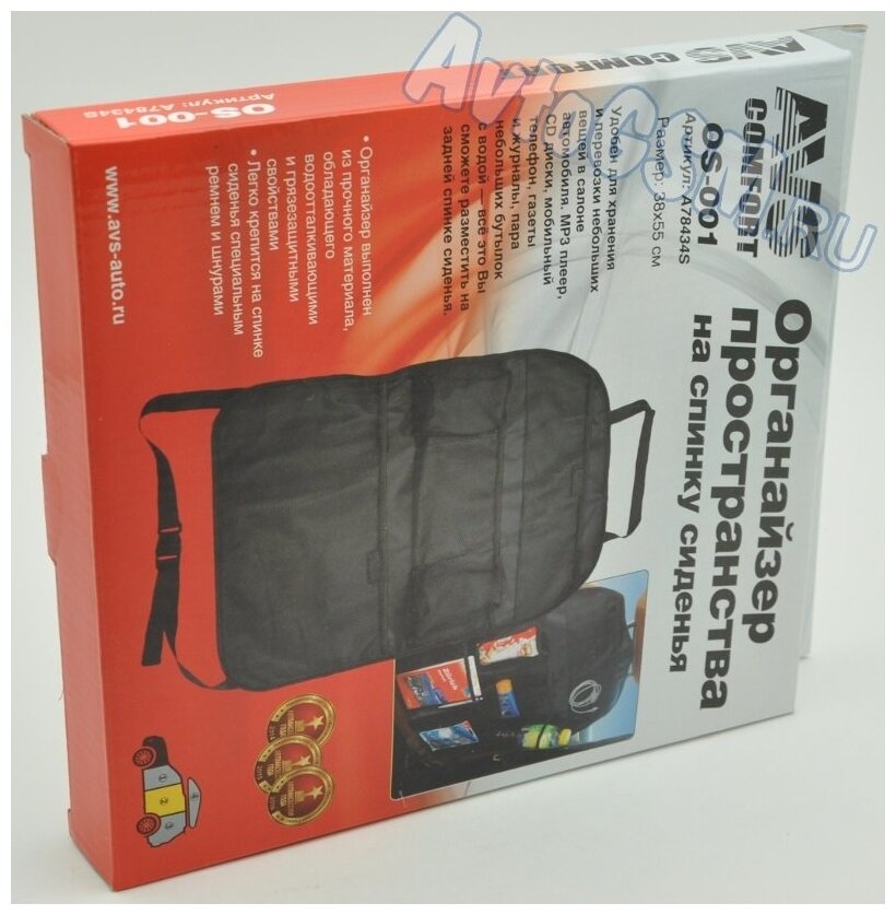 Данное приспособление предназначено для перевозки и хранения любых предметов при помощи вместительных карманов. Также, все самые необходимые вещи будут всегда под рукой. Вас, несомненно, порадует простота крепления к подголовнику сиденья с помощью специальных веревок и ремня. Важно отметить и защитную функцию, которую выполняет данный органайзер. Б