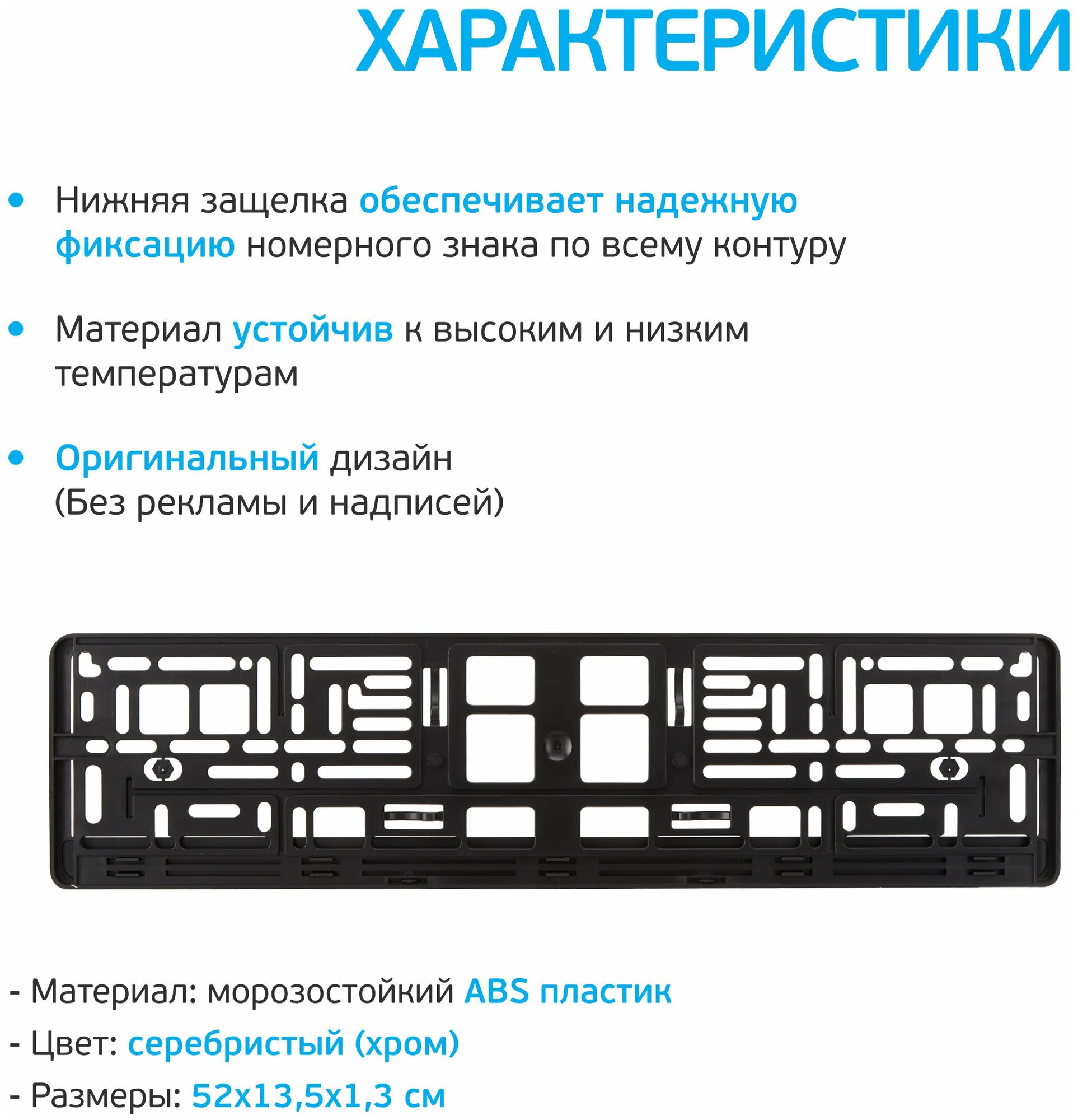 Рамка под номер, изготовлена из прочного эластичного пластика, предназначена для удобной установки номерных знаков на автомобиль. Конструкция открытия рамки - "нижняя защелка". Данная конструкция обладает надежным креплением номерного знака по всему контуру.ХарактеристикиМатериал: морозостойкий ABS пластикЦвет: серебристый(хром)Размеры: 52 см х 13,5 см х 1,3 см.Состав:Материал: морозостойкий ABS пластик