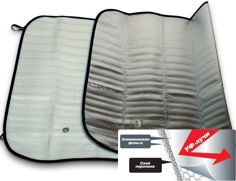 Неоценима польза от данного аксессуара и на парковке, так как с его помощью Вы можете защитить дополнительное оборудование, установленное на лобовом стекле, например, радар-детектор или видеорегистратор. Гибкая конструкция шторки позволяет сложить ее гармошкой, поэтому она не займет много места в салоне автомобиля. Шторка изготовлена из алюминиевой фольги, нанесенной на подложку из воздушно-пузырчатой пленки, имеет следующие габариты: 130х60 см. Данное изделие подойдет для установки практически на любое лобовое стекло автомобиля.