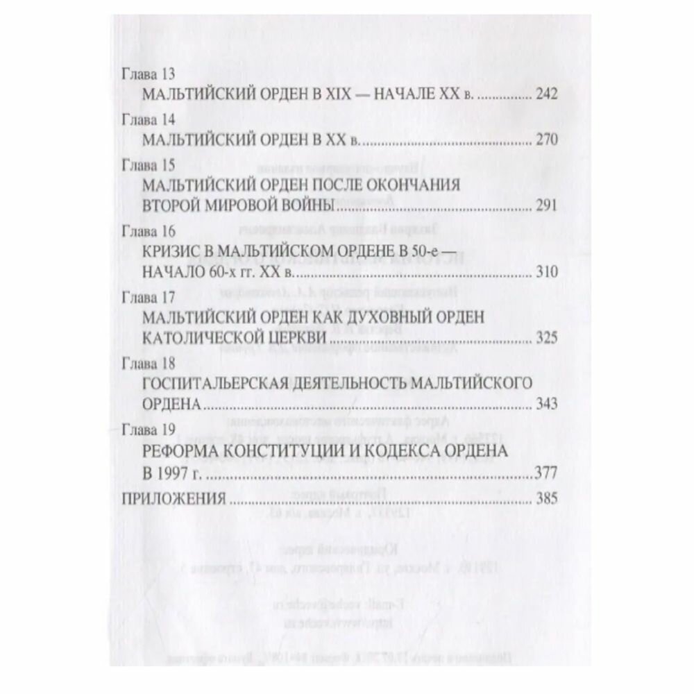Монография посвящена истории старейшего духовно-рыцарского ордена Римско-католической церкви. На протяжении своей многовековой истории орден не раз вынужден был менять свое местонахождение, менялось и название ордена и его рыцарей. В начале они именовались госпитальерами или иоаннитами, с 1291 года - "рыцарями Кипра", с 1306 года - "рыцарями Родоса". Только тогда, когда в 1530 году орден получил во владение от императора Священной Римской империи германской нации Карла V остров Мальту, он получил имя "Мальтийский". Впрочем, и до сего дня орден продолжают называть "орденом иоаннитов", "орденом госпитальеров" или "Орденом святого Иоанна Иерусалимского". Большое внимание в исследовании уделено взаимоотношениям ордена и Российской империи. Вводятся в научный оборот неизвестные российским исследователям документы из зарубежных публикаций и российских архивов. Впервые читателям предлагается исторический очерк о Мальтийском ордене XIX-XX вв.