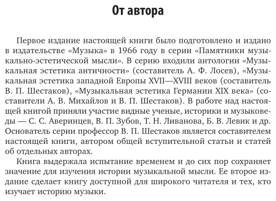 В издании представлены наиболее важные эстетические трактаты средневековья и эпохи Возрождения, позволяющие представить становление и развитие музыкальной эстетики стран Западной Европы, начиная с V и заканчивая XVI веком. Издание имеет своей целью ознакомить широких читателей с малоизученной эпохой в развитии эстетической мысли прошлого, помочь музыковедам и философам в изучении истории эстетических теорий западноевропейского средневековья и Возрождения.