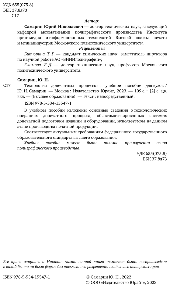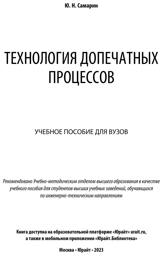 Книга Технология допечатных процессов (Юрий Николаевич Самарин); ЮРАЙТ, 2022