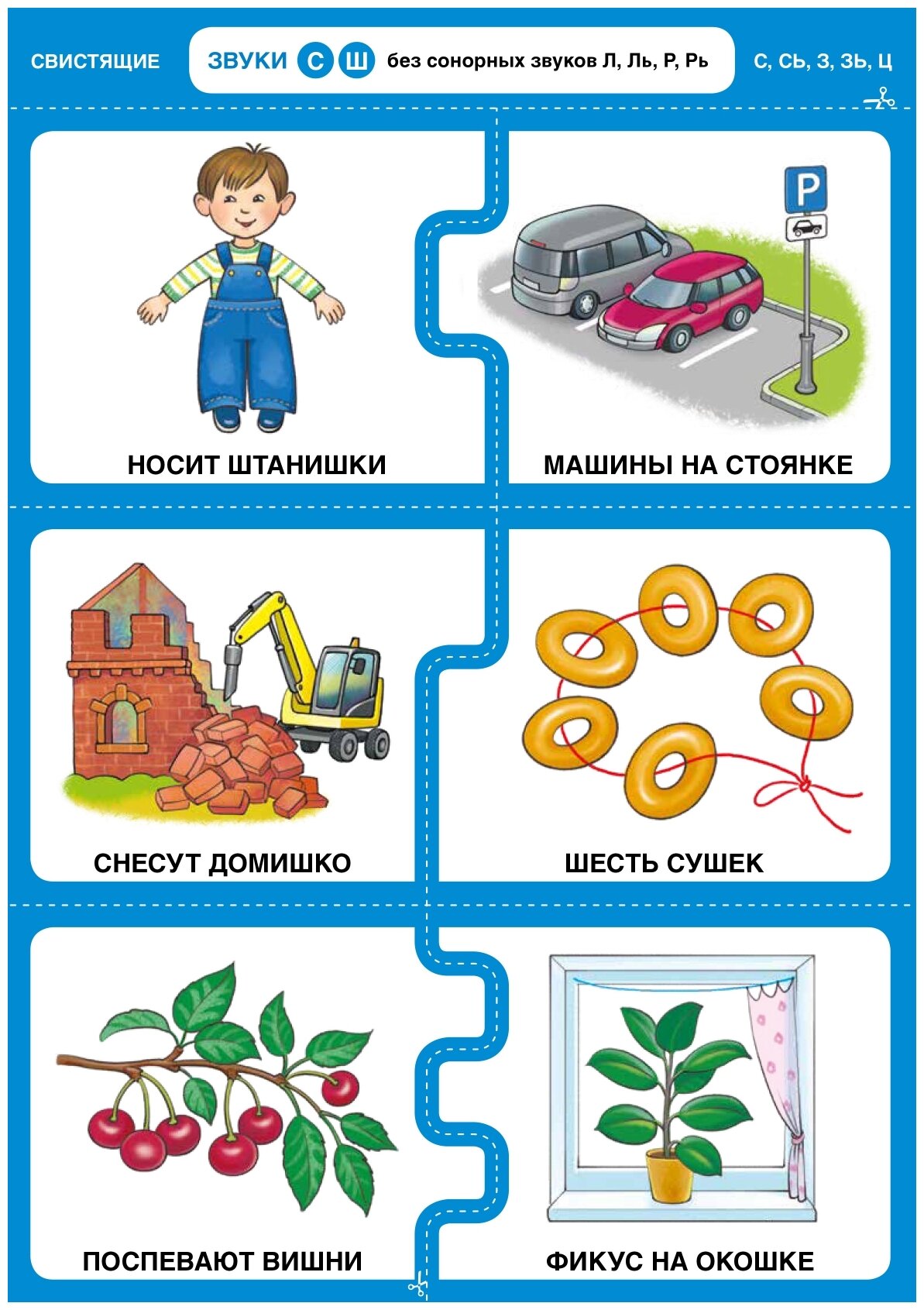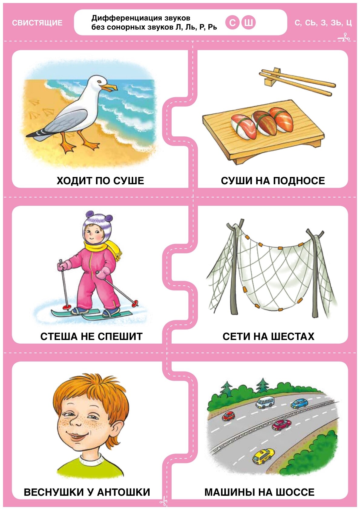 В полном объёме! Исчерпывающий охват проблемных звуков.Сразу в дело! Продуманный и обширный подбор тренировочных слов и словосочетаний.Индивидуальный подход! Выбор карточек без звуков, которые ребёнок произносит дефектно.В игре! Занимательная непринуждённая форма игры.Нужно каждому ребёнку! Дифференциация этих звуков вызывает трудности у всех детей. Важно научиться! Чистое произношение и различение всех звуков - основа грамотной речи и грамотного письма.Комплект логопедических игровых карточек для дифференциации звуков в сочетаниях слов:С-Ш, С-З, С-Ц.