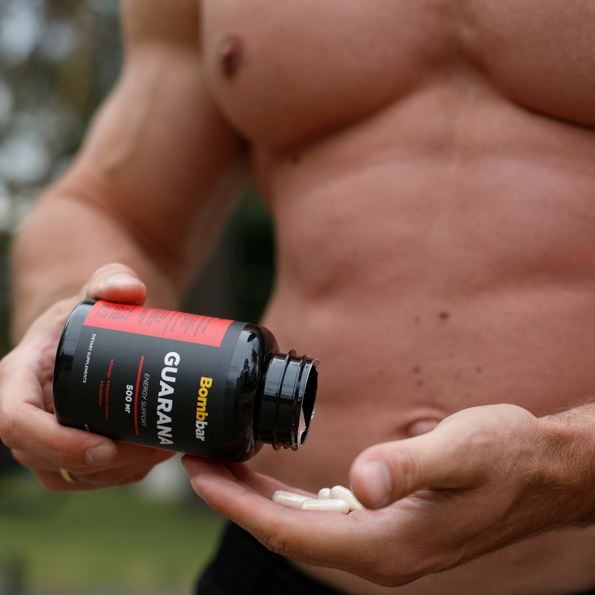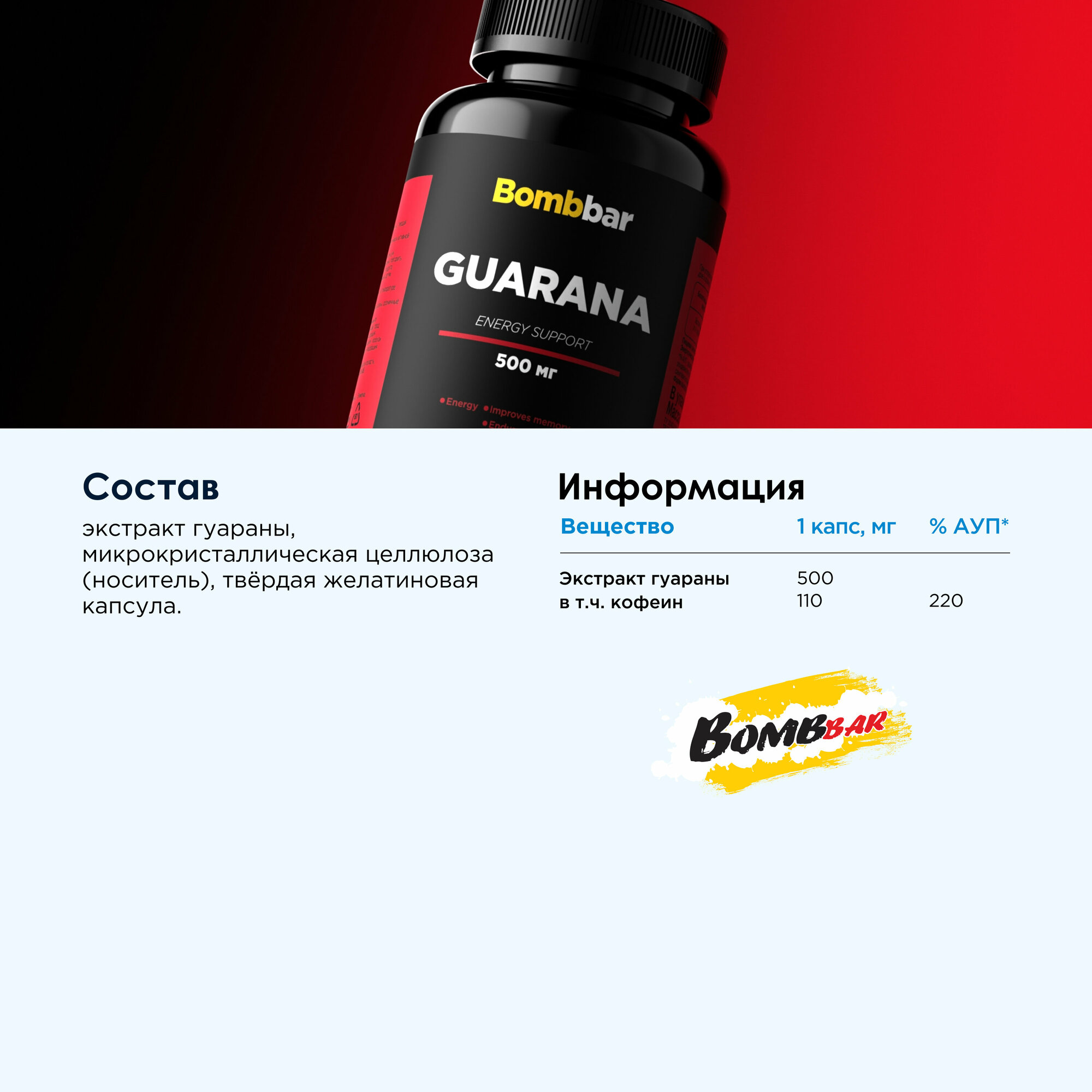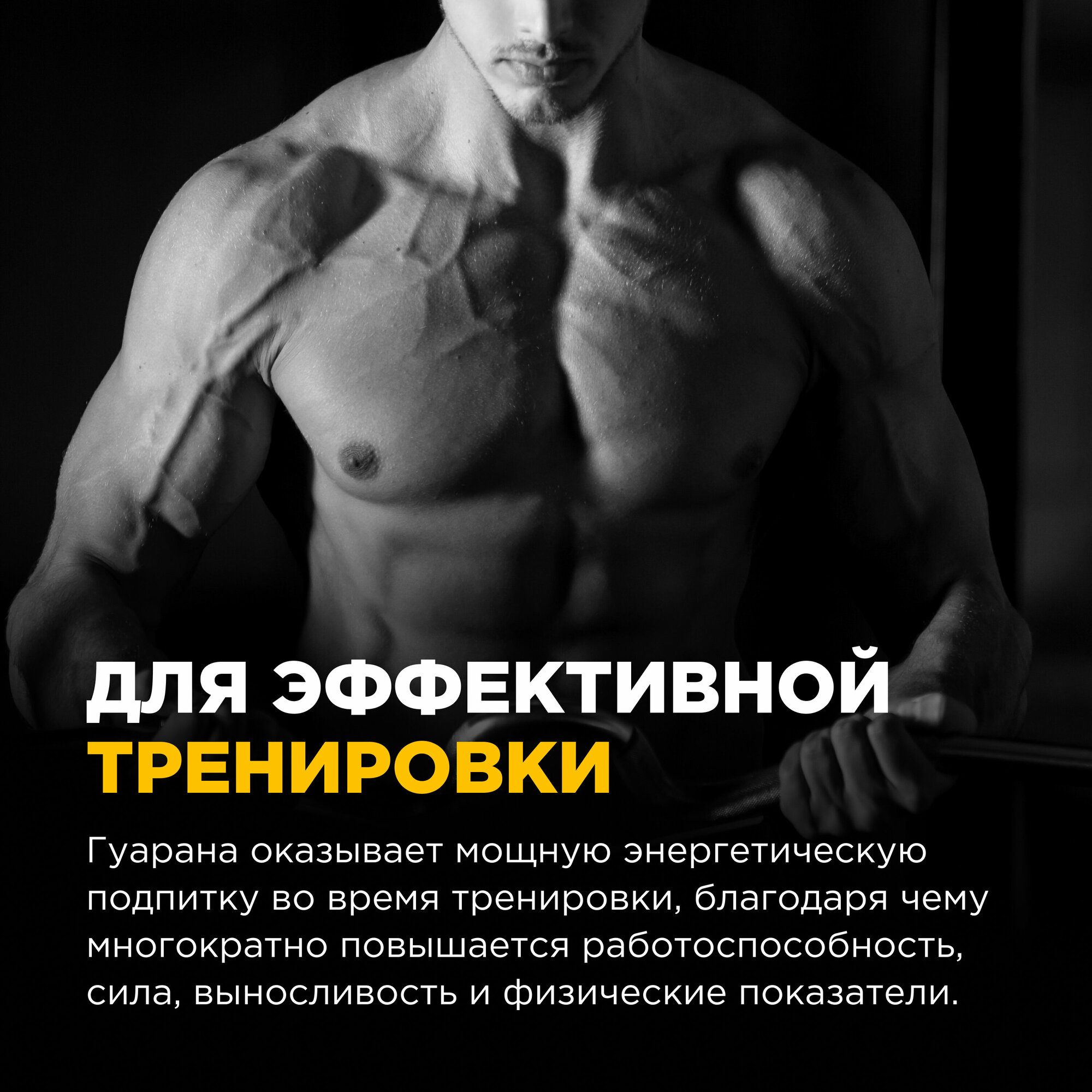 Биологически активная добавка к пище «гуарана/GUARANA», капсулы массой 625 мг.По воздействию на организм оно практически идентично всеми любимому кофеину. Но есть одно «но» - гуаранин усваивается медленно, постепенно, примерно в течение двух-трех часов. Кофеин же бомбит сразу и не дает отсроченного эффекта. Именно поэтому гуарана более предпочтительна, если тренировка будет длительной и сложной. Она усваивается медленно, стимулирует нервную систему бережно и реже вызывает негативные побочки.О гуаране сегодня мы знаем благодаря хитрым жителям бассейна Амазонки. Секрет их энергичности и постоянно приподнятого настроения в гуаране. Дикари готовят из растения чай и пьют его, чтобы стать более выносливыми и сильными.В гуаране содержится огромное количество ценных соединений:гуаранин;теобромин;цинк;магний;марганец;натрий;эфирные масла;полифенолы;различные дубильные соединения;теофиллин;алкалоиды ксантинового ряда;амиды;витамины Е, А, группы В.В Бразилии из растения изготавливают лекарства, которые избавляют от:нервных переживаний;мышечных болей;мигрени;болезненных спазмов;повышенной утомляемости;симптомов алкогольной интоксикации.В спортивное питание гуарановый порошок добавляют, чтобы он:немного повышал кровяное давление;ускорял обменные процессы;бодрил;учащал пульс;помогал фокусироваться;минимизировал болевые ощущения;подавлял аппетит;окислял жиры и ускорял жиросжигание;повышал выносливость.Гурана сравнима с хорошим энергетиком. Если учесть, что она имеет полностью растительное происхождение и работает более бережно, чем кофеин, то цены ей нет. Так как гуарана обладает обезболивающими свойствами, ее часто задействуют в спортивной медицине. Она не просто уменьшает боль при травмах, растяжениях и вывихах, но и форсирует выведение молочной кислоты из мышечных тканей, снижает дискомфортные ощущения при выполнении сложных спортивных упражнений.Гуарана помогает:интенсивно тренироваться и не стонать от мышечной боли;быть выносливым и веселым;укрепить память;при сексуальных расстройствах;фокусироваться;добиваться поставленных целей;успокаиваться при стрессе;нормализовать эмоциональный фон;быстро восстанавливаться после травм, операций;при повышенном аппетите.С ней гораздо проще заниматься спортом, справляться с интеллектуальными нагрузками. Особенна полезна она людям, которые готовятся к спортивным соревнованиям и выступлениям. Гуарана стимулирует на интенсивную и длительную работу в спортивном зале. Она окисляет жиры и помогает в похудении. Если сочетать ее с жиросжигателями, то эффект будет просто бомбическим. При этом помните, что соединение обладает легким мочегонным эффектом. Поэтому дополнительно подключать диуретики не стоит.Гуарана хорошо комбинируется и с другими видами спортивного питания:ВСАА;протеиновыми смесями;витаминно-минеральными составами;предтрениками.Что касается последних, то здесь важно смотреть, чтобы в предтренировочном стеке изначально не было гуараны, так как общая доза может получиться слишком большой.