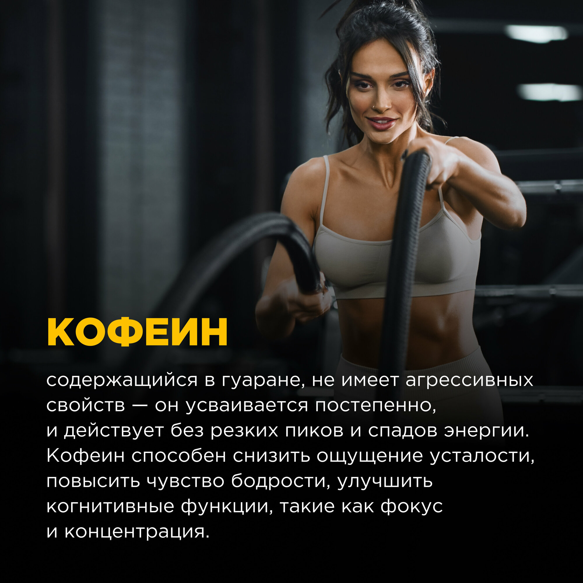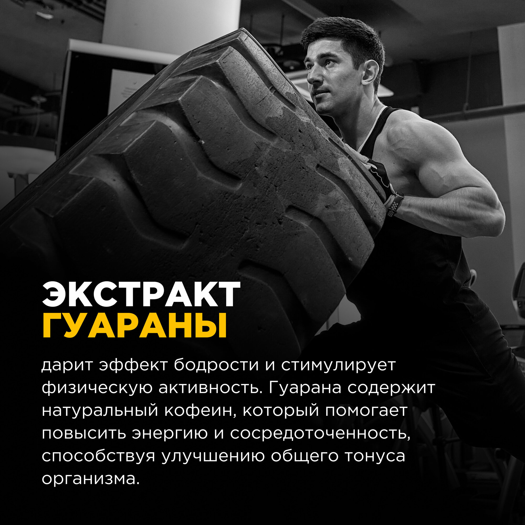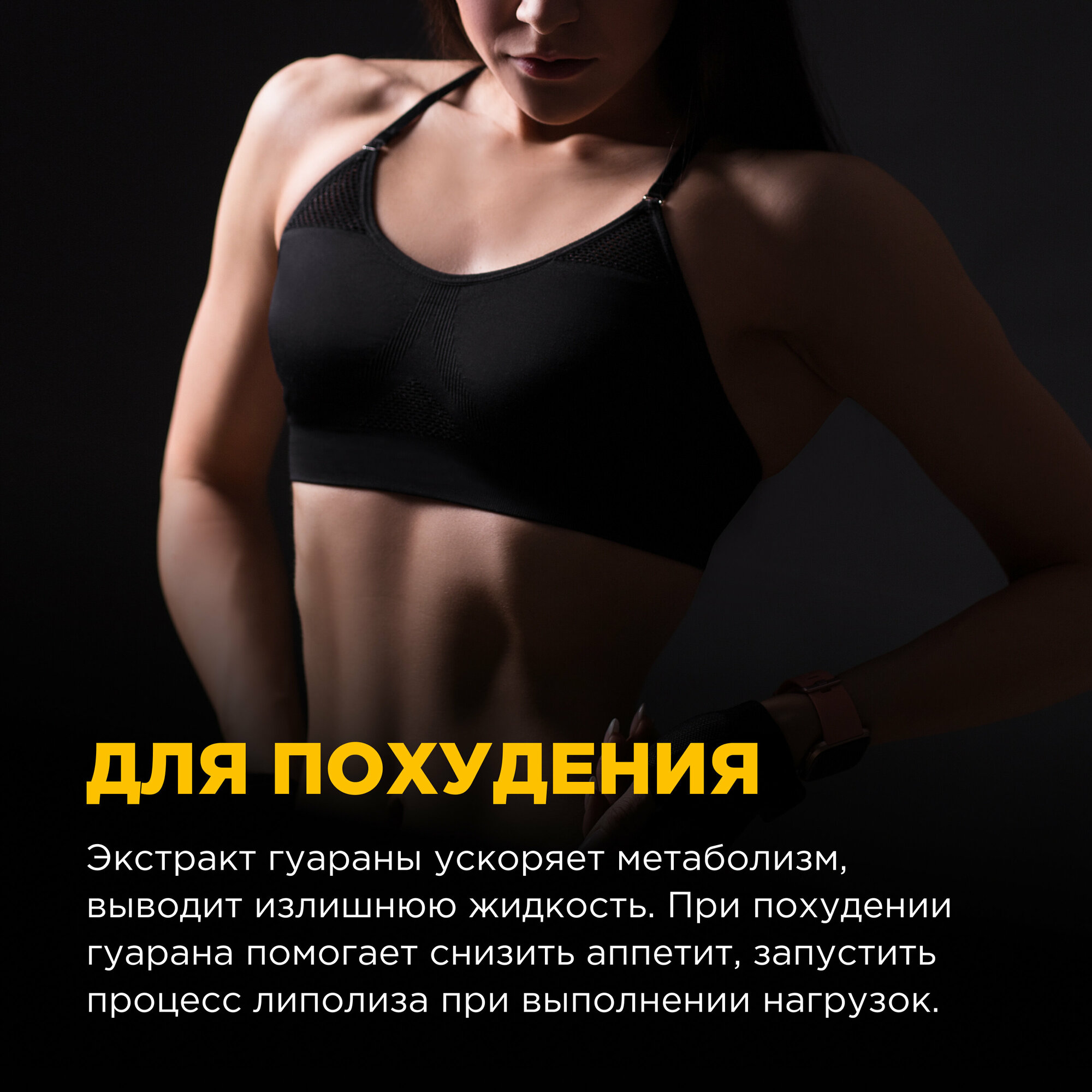 Биологически активная добавка к пище «гуарана/GUARANA», капсулы массой 625 мг.По воздействию на организм оно практически идентично всеми любимому кофеину. Но есть одно «но» - гуаранин усваивается медленно, постепенно, примерно в течение двух-трех часов. Кофеин же бомбит сразу и не дает отсроченного эффекта. Именно поэтому гуарана более предпочтительна, если тренировка будет длительной и сложной. Она усваивается медленно, стимулирует нервную систему бережно и реже вызывает негативные побочки.О гуаране сегодня мы знаем благодаря хитрым жителям бассейна Амазонки. Секрет их энергичности и постоянно приподнятого настроения в гуаране. Дикари готовят из растения чай и пьют его, чтобы стать более выносливыми и сильными.В гуаране содержится огромное количество ценных соединений:гуаранин;теобромин;цинк;магний;марганец;натрий;эфирные масла;полифенолы;различные дубильные соединения;теофиллин;алкалоиды ксантинового ряда;амиды;витамины Е, А, группы В.В Бразилии из растения изготавливают лекарства, которые избавляют от:нервных переживаний;мышечных болей;мигрени;болезненных спазмов;повышенной утомляемости;симптомов алкогольной интоксикации.В спортивное питание гуарановый порошок добавляют, чтобы он:немного повышал кровяное давление;ускорял обменные процессы;бодрил;учащал пульс;помогал фокусироваться;минимизировал болевые ощущения;подавлял аппетит;окислял жиры и ускорял жиросжигание;повышал выносливость.Гурана сравнима с хорошим энергетиком. Если учесть, что она имеет полностью растительное происхождение и работает более бережно, чем кофеин, то цены ей нет. Так как гуарана обладает обезболивающими свойствами, ее часто задействуют в спортивной медицине. Она не просто уменьшает боль при травмах, растяжениях и вывихах, но и форсирует выведение молочной кислоты из мышечных тканей, снижает дискомфортные ощущения при выполнении сложных спортивных упражнений.Гуарана помогает:интенсивно тренироваться и не стонать от мышечной боли;быть выносливым и веселым;укрепить память;при сексуальных расстройствах;фокусироваться;добиваться поставленных целей;успокаиваться при стрессе;нормализовать эмоциональный фон;быстро восстанавливаться после травм, операций;при повышенном аппетите.С ней гораздо проще заниматься спортом, справляться с интеллектуальными нагрузками. Особенна полезна она людям, которые готовятся к спортивным соревнованиям и выступлениям. Гуарана стимулирует на интенсивную и длительную работу в спортивном зале. Она окисляет жиры и помогает в похудении. Если сочетать ее с жиросжигателями, то эффект будет просто бомбическим. При этом помните, что соединение обладает легким мочегонным эффектом. Поэтому дополнительно подключать диуретики не стоит.Гуарана хорошо комбинируется и с другими видами спортивного питания:ВСАА;протеиновыми смесями;витаминно-минеральными составами;предтрениками.Что касается последних, то здесь важно смотреть, чтобы в предтренировочном стеке изначально не было гуараны, так как общая доза может получиться слишком большой.