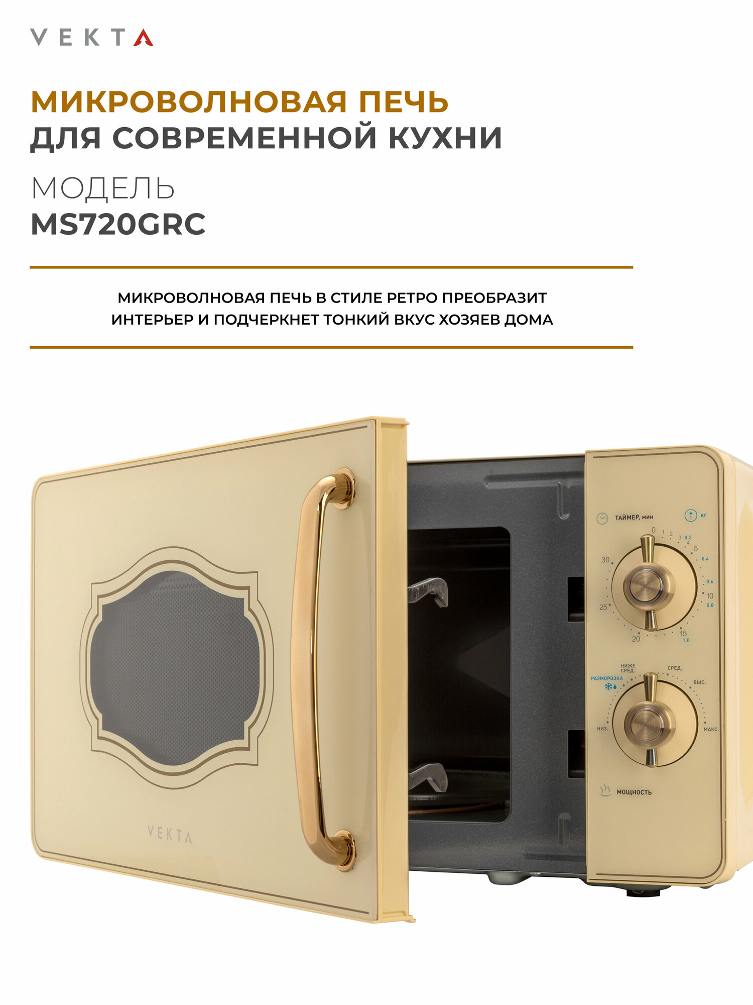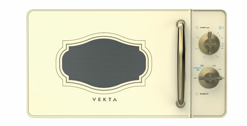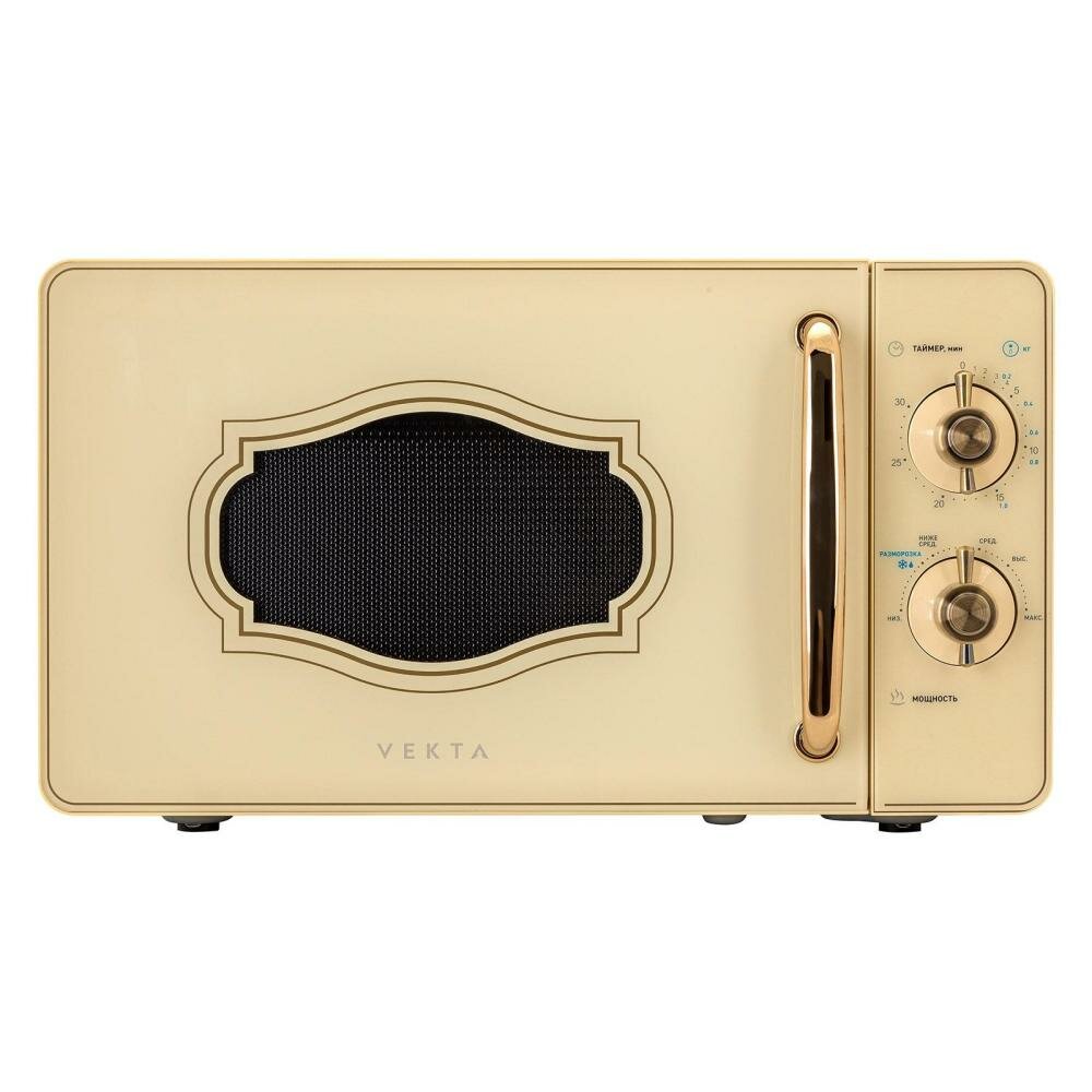 Модель VEKTA исполнена в уникальном ретро-дизайне и представлена в классическом цвете слоновой кости.Микроволновая печь VEKTA - идеальное решение для быстрого приготовления и разогрева пищи. Она обладает простым и удобным механическим управлением, которое позволяет легко выбрать один из шести уровней мощности в зависимости от требуемого времени и интенсивности нагрева.С помощью режима разморозки вы сможете быстро и равномерно разморозить продукты без необходимости подсчета времени. Шкала разморозки по весу позволяет точно определить необходимое время размораживания.Камера микроволновой печи имеет вместительность 20 литров и покрыта специальной эмалью легкой очистки, которая не впитывает запахи и обеспечивает простоту в уходе. Вы сможете быстро и легко очистить камеру от остатков пищи, сохраняя ее идеальную чистоту.