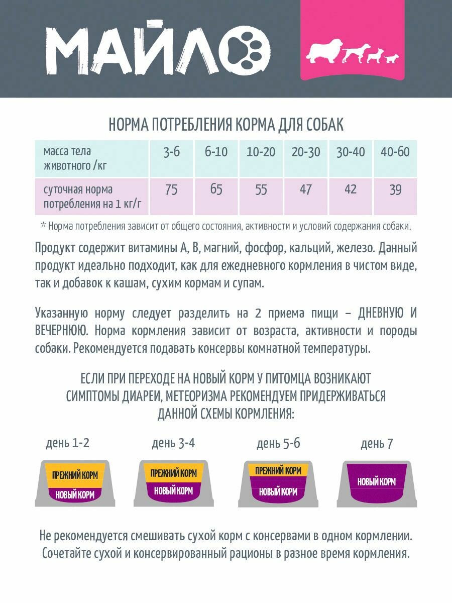 Майло - это высококачественное кормовое питание для собак, созданное на основе различных видов мяса. Корм обеспечивает сбалансированное питание питомца, удовлетворяя его потребности в важных питательных веществах.Наш корм состоит из комбинации разных видов субпродуктов, которые могут включать говядину, курицу, индейку и другие мясные субпродукты. Это позволяет обогатить рацион собаки разнообразными протеинами, которые являются основной составляющей здорового питания животного.Особенности корма включают:1. Белок: оно содержит высокое содержание протеина, что является основным строительным материалом для мышц и тканей собаки. Протеины являются не только источником энергии, но и участвуют во многих процессах в организме собаки, таких как рост и регенерация.2. Жиры: содержит определенное количество жиров, которые являются источником энергии и помогают питанию собаки быть полноценным. Они также необходимы для усвоения некоторых витаминов и улучшения состояния кожи и шерсти.3. Витамины и минералы: необходимые для поддержания здоровья собаки. Они помогают поддерживать нормальное функционирование органов и систем организма, а также укрепляют иммунитет и защищают от различных заболеваний.4. Природные ингредиенты: такие как овощи, фрукты и травы, которые обогащают питание собаки витаминами и антиоксидантами. Они также могут содержать пребиотики, которые поддерживают здоровье пищеварительной системы.Важно следить за рекомендациями по кормлению и предоставлять собаке правильные порции для сохранения оптимального состояния здоровья.