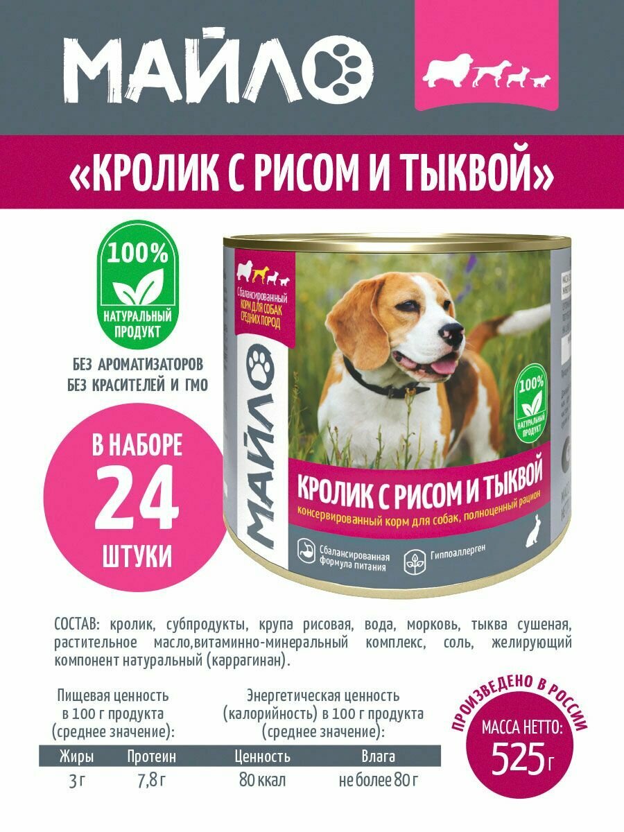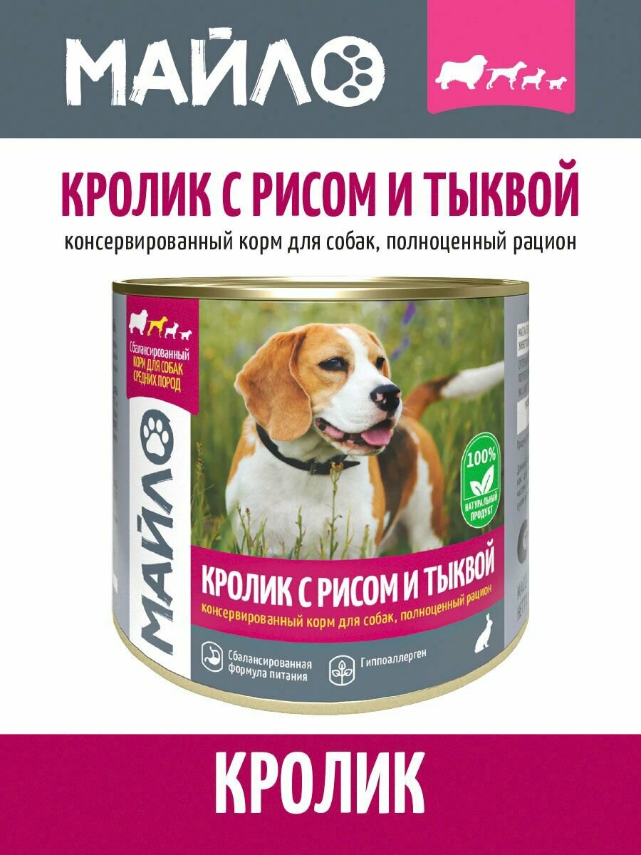 Корм влажный для собак Майло Кролик с рисом и тыквой 525 г