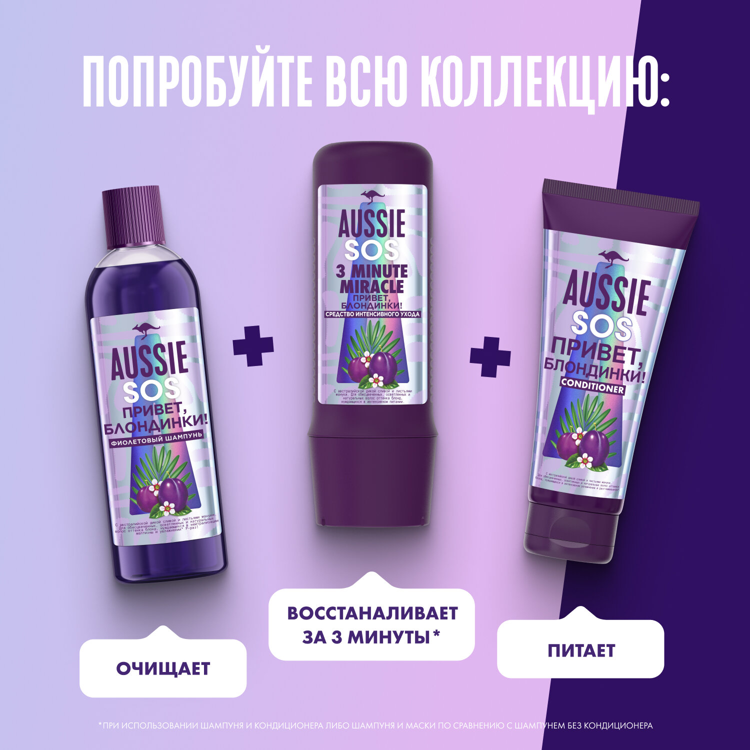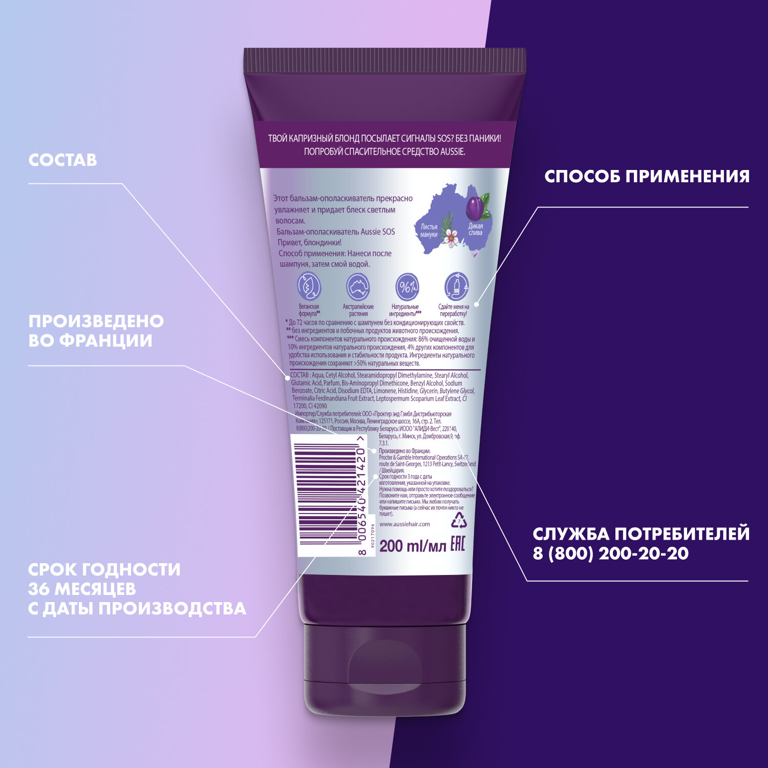 Твой капризный блонд посылает сигналы SOS? Без паники! Aussie (Осси) спешит на помощь. Веганский бальзам-ополаскиватель Aussie SOS Привет, Блондинки! с экстрактами австралийской дикой сливы и листьев мануки настоящее SOS-спасение для сухих или поврежденных светлых волос. Этот восхитительный бальзам-ополаскиватель создан специально для окрашенных, обесцвеченных, натуральных светлых и седых волос. Он подарит увлажнение и потрясающий блеск светлым волосам неважно, короткие они, длинные, имеют пепельный, золотистый или платиновый оттенок. Обогащенный австралийскими суперфудами бальзам на 96% состоит из натуральных ингредиентов и не содержит продуктов животного происхождения. Кстати, мы упомянули, что аромат просто головокружительный? Для wow-эффекта используй его в сочетании с шампунем и средством интенсивного ухода из коллекции Aussie SOS Привет, Блондинки!. Все продукты Aussie производятся без тестирования на животных по стандарту PETA. Aussie это любовь с первого применения!