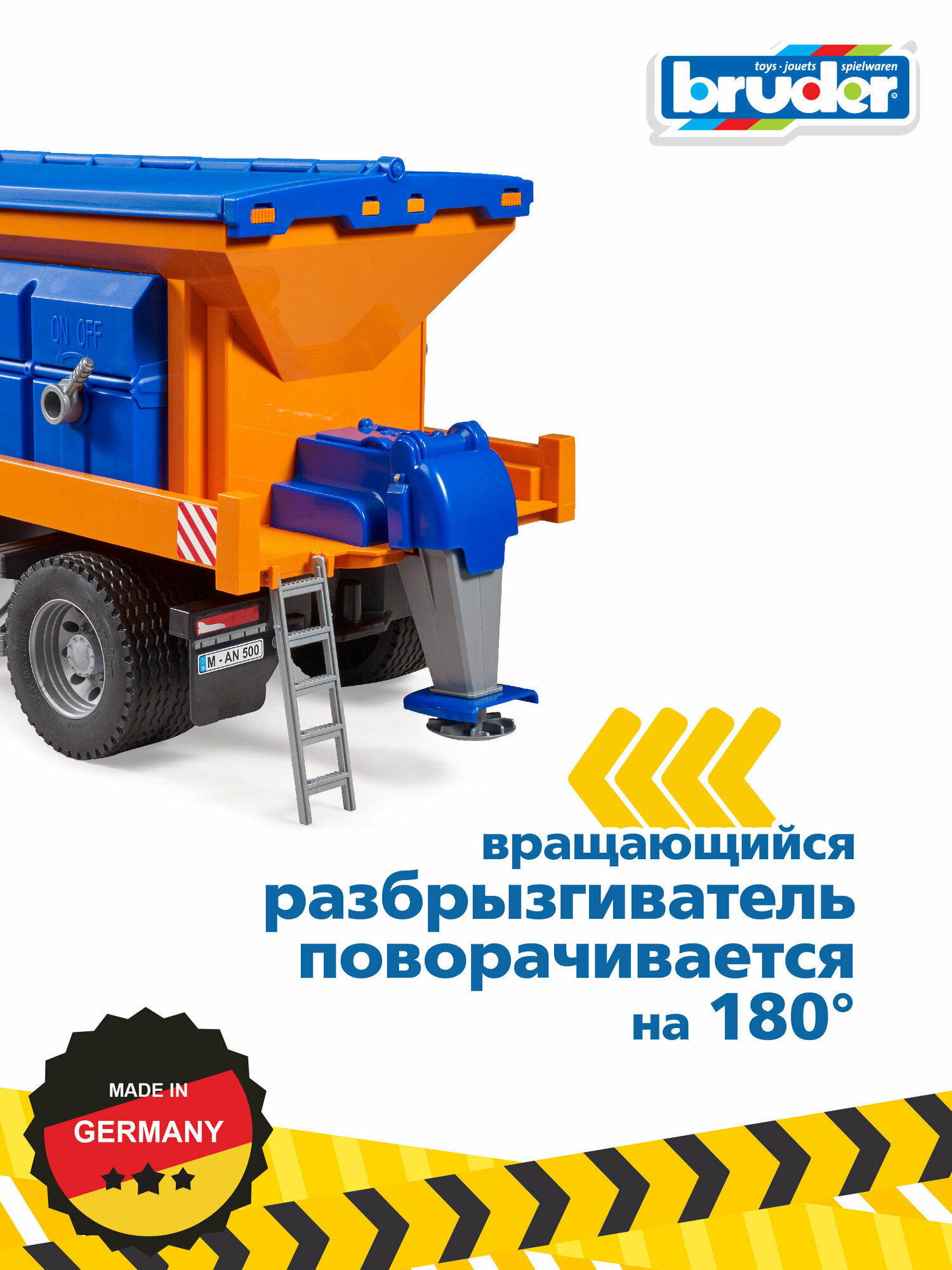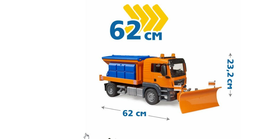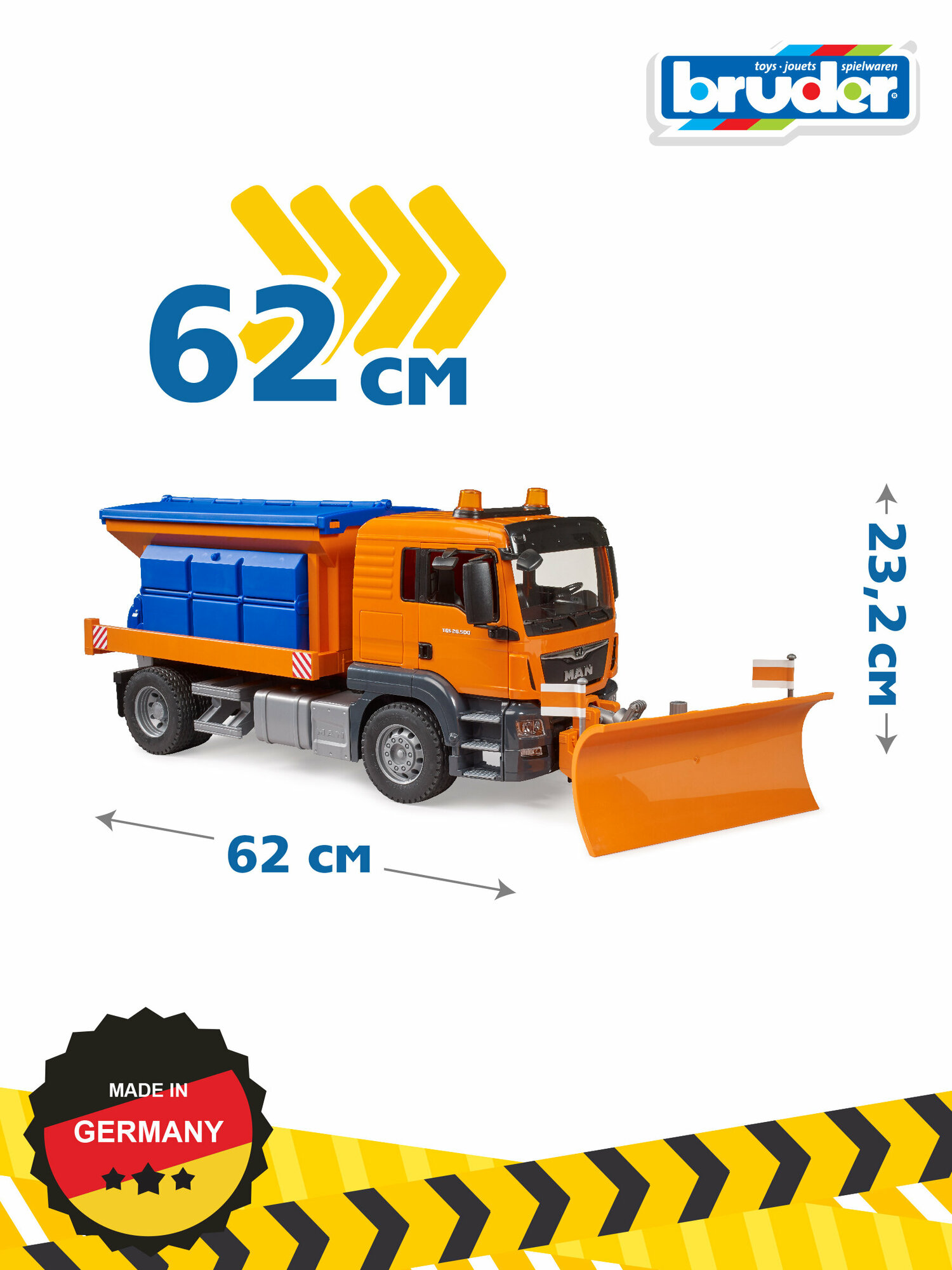 Игрушка от бренда Bruder Снегоуборочная машина MAN TGS 03785 несомненно понравится вашему ребенку. .сильный снегопад по стране. как только в дорожных сводках упоминается что-то подобное, машины зимней службы вовремя включаются в работу, чтобы разрядить обстановку. Компания BRUDER, известная своими реалистичными всепогодными транспортными средствами, создала впечатляющую и точную копию оригинального снегоуборочного отвала с помощью зимнего сервисного автомобиля MAN TGS. Широкий, регулируемый по высоте и, конечно же, съемный отвал справится с расчисткой даже самого толстого снега и созданием правильной полосы движения. Чрезвычайно реалистичный пескоструйный механизм. MAN TGS можно дооснастить свето-звуковым модулем BRUDER (артикул 02801).