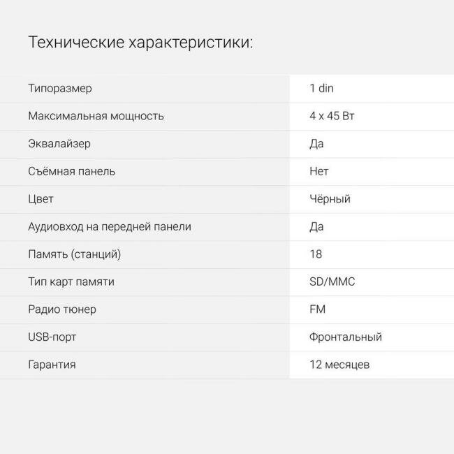 | Комплект поставки | Автомагнитола, документация |