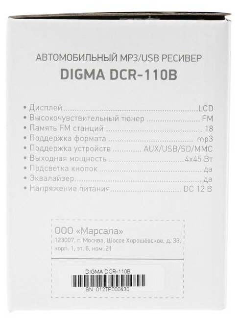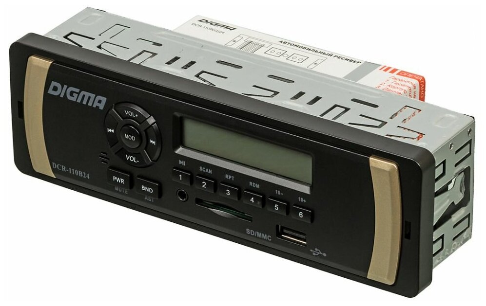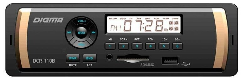 Автомагнитола Digma DCR-110 – компактная бездисковая модель, легко устанавливающаяся в стандартное посадочное место. Она может считывать аудиофайлы с флешек и карт памяти SD, а также работать с портативными плеерами, подключающимися к 3,5-миллиметровому разъему. Ее цифровой радиоприемник способен сохранять в памяти частоты 18 станций и считывать текстовые сообщения RDS. Для тонкой настройки звучания в магнитоле предусмотрен эквалайзер.