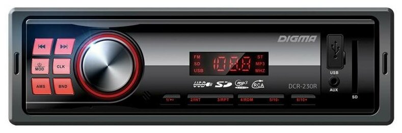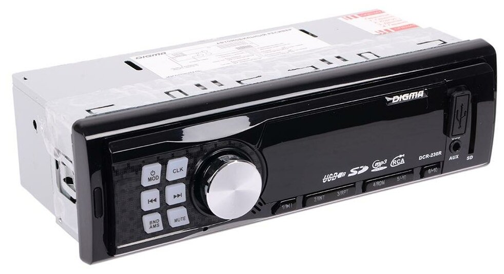 Автомагнитола Digma – компактная бездисковая модель, легко устанавливающаяся в стандартное посадочное место. Она может считывать аудиофайлы с флешек и карт памяти SD, а также работать с портативными плеерами, подключающимися к 3,5-миллиметровому разъему. Ее цифровой радиоприемник способен сохранять в памяти частоты 18 станций и считывать текстовые сообщения RDS. Для тонкой настройки звучания в магнитоле предусмотрен эквалайзер.