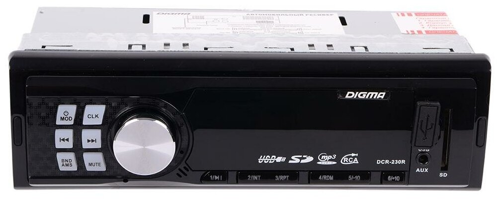 К ключевым характеристикам автомагнитолы Digma можно отнести встроенный MP3 декодер, высокочувствительный FM тюнер с памятью на 18 радиостанций, а также возможность воспроизведения музыкального контента с SD/MMC и USB носителей. Выходная мощность 4х45 Вт и встроенный эквалайзер обеспечивают великолепное звучание.