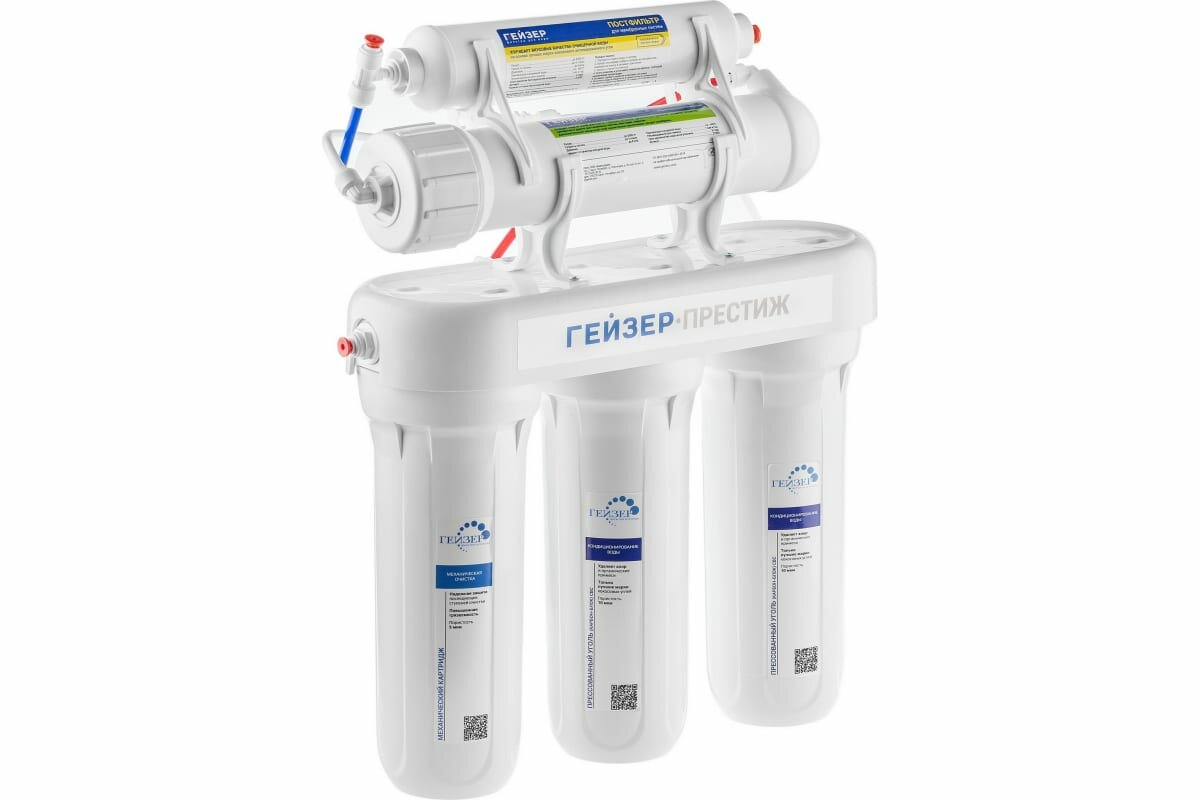 ГЕЙЗЕР Престиж-П — фильтр для очистки воды с помпой (дает возможность установки в водопроводную систему с пониженным давлением). Избавляется от 98-99% примесей, а также очищает от вирусов, бактерий, запаха и неприятного вкуса. Фильтр включает в себя 3 картриджа и обратноосматическую мембрану. Скорость фильтрации — 0,15 л/мин. За сутки производит до 200 л.