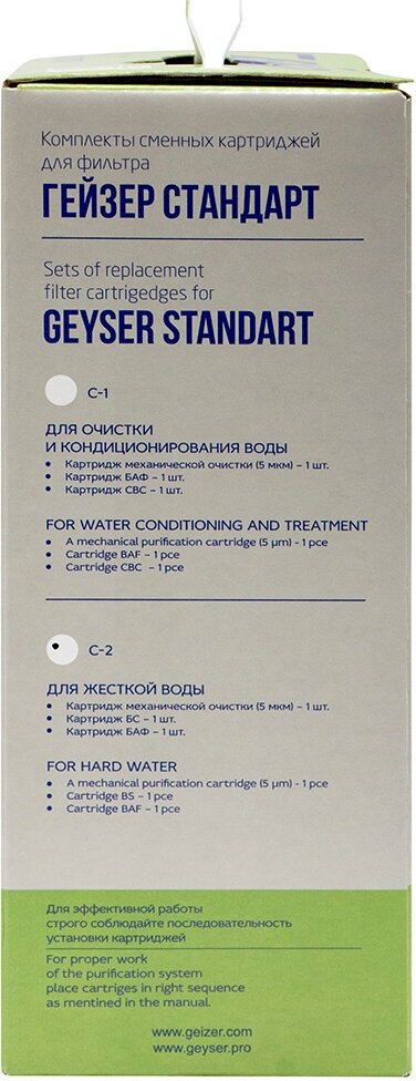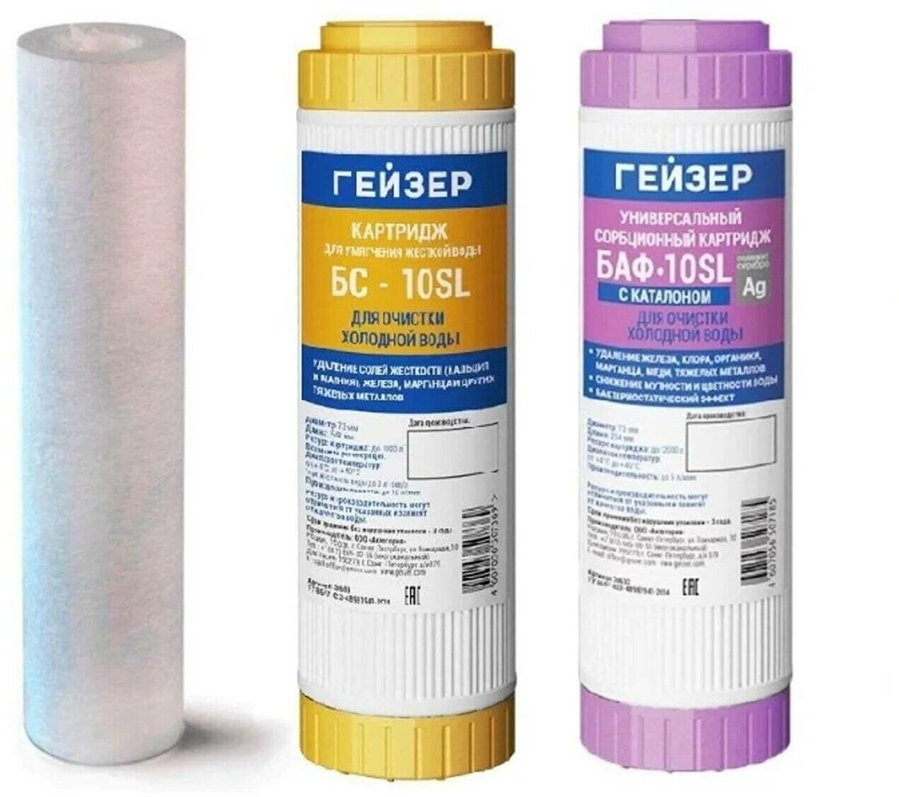 Комплект сменных картриджей Гейзер С-2 для фильтра Гейзер-Стандарт для жесткой воды. Картридж PP 5 - 10SL - удаляет нерастворимые частицы размером до 5 мкм (ржавчина, взвеси). Картридж БС - 10SL - для удаления солей жесткости. Картридж БАФ - SL10 - универсальный картридж для удаления хлора, органических примесей, железа и тяжелых металлов. Содержит серебро. Замена картриджей для семьи из 3-4 человек в среднем 1 раз в год.