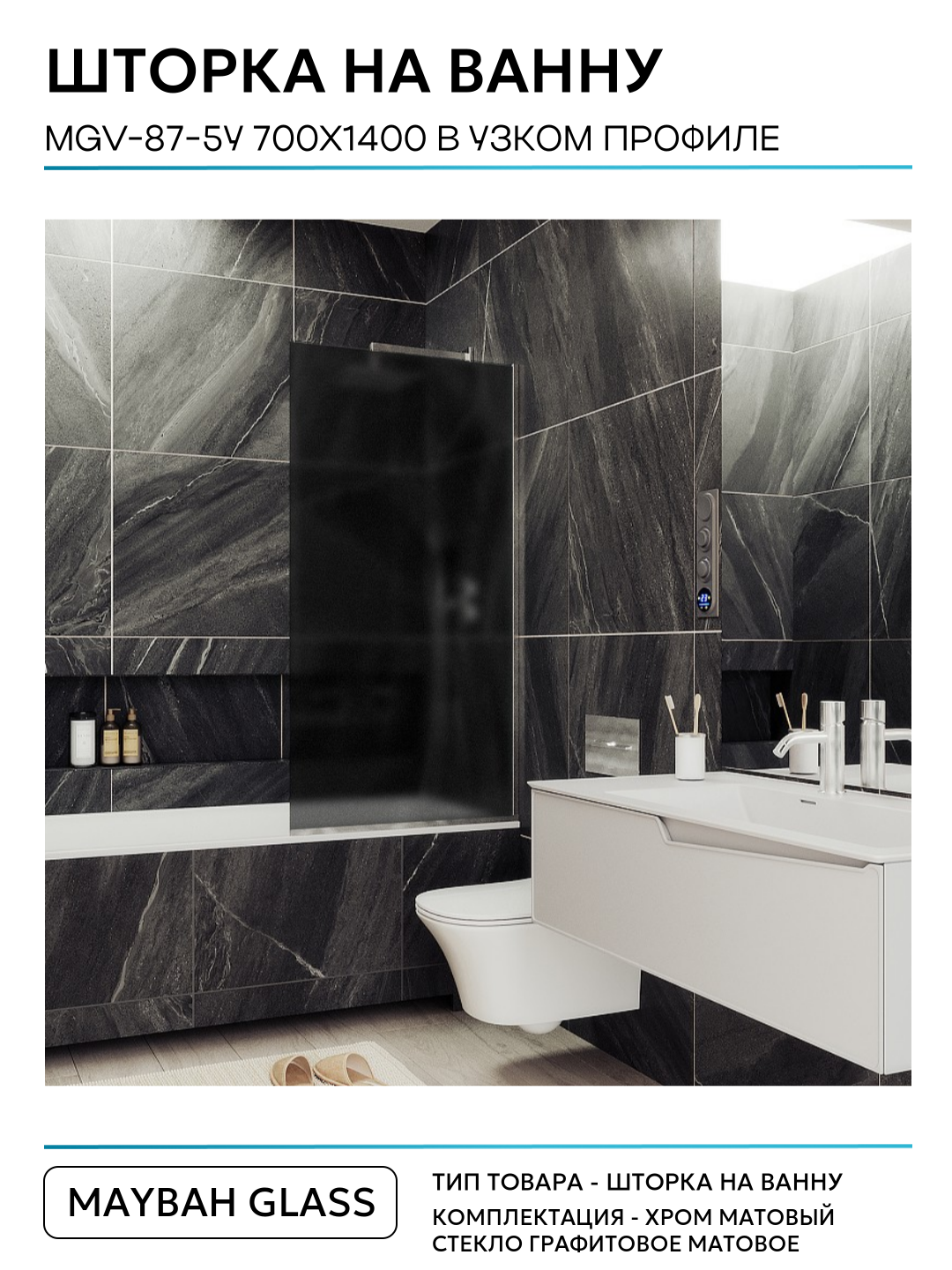 Шторка на ванну Maybah Glass 70х140 см графит матовый профиль хром матовый MGV-87-5у