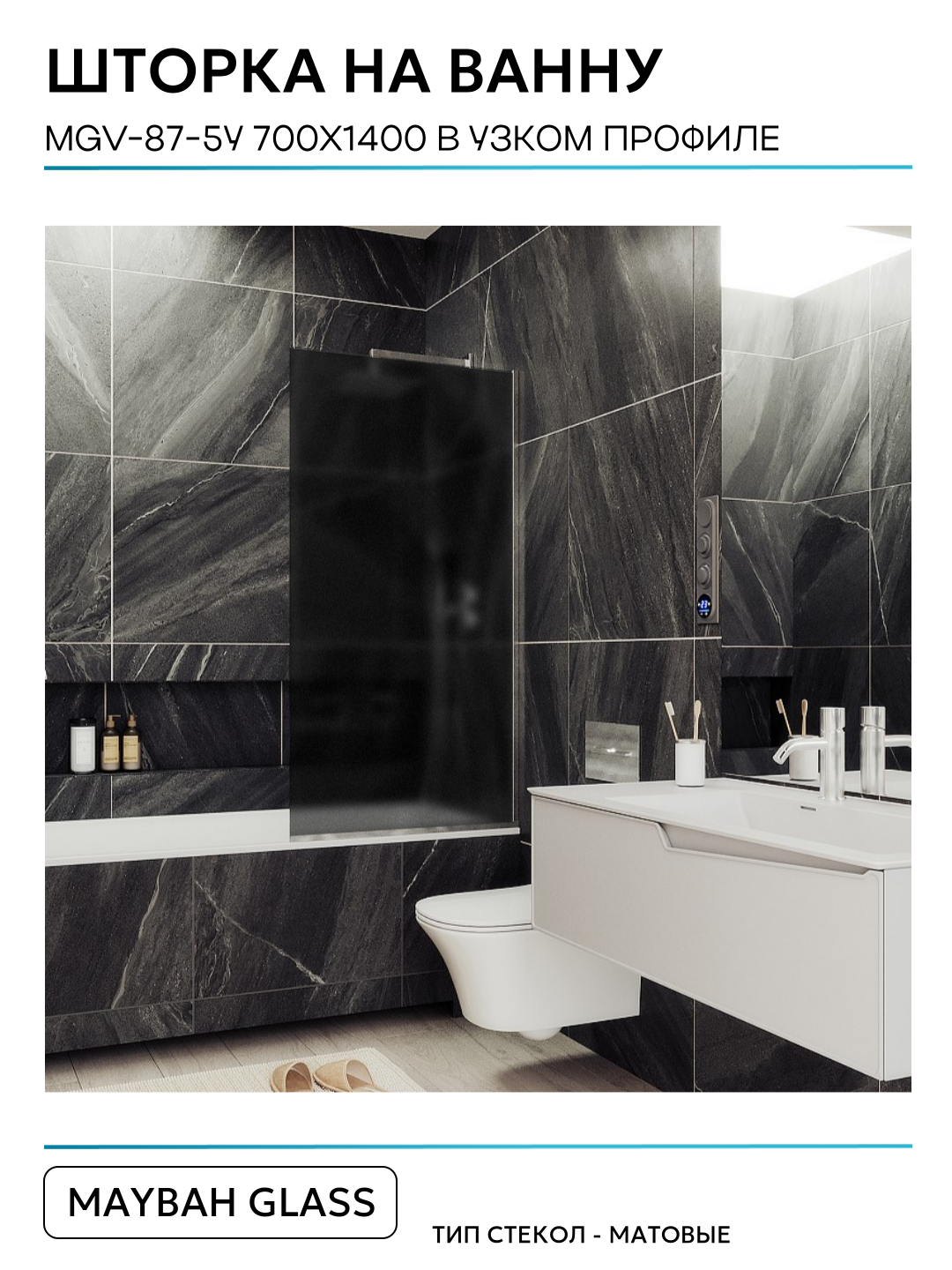 - Исполнение полотна шторки: графитовое матовое закаленное стекло, толщиной 8 мм.