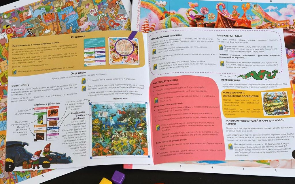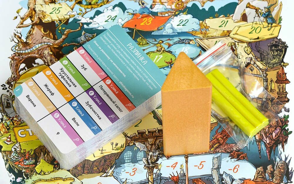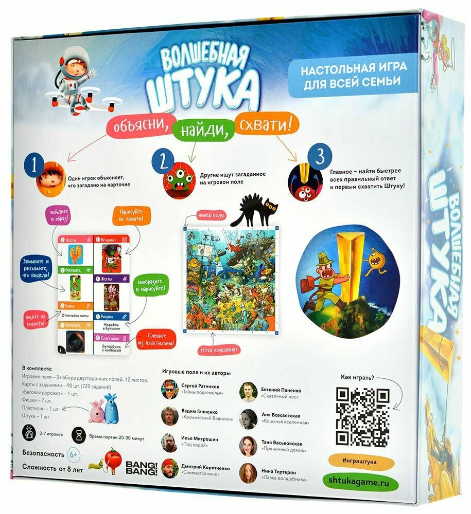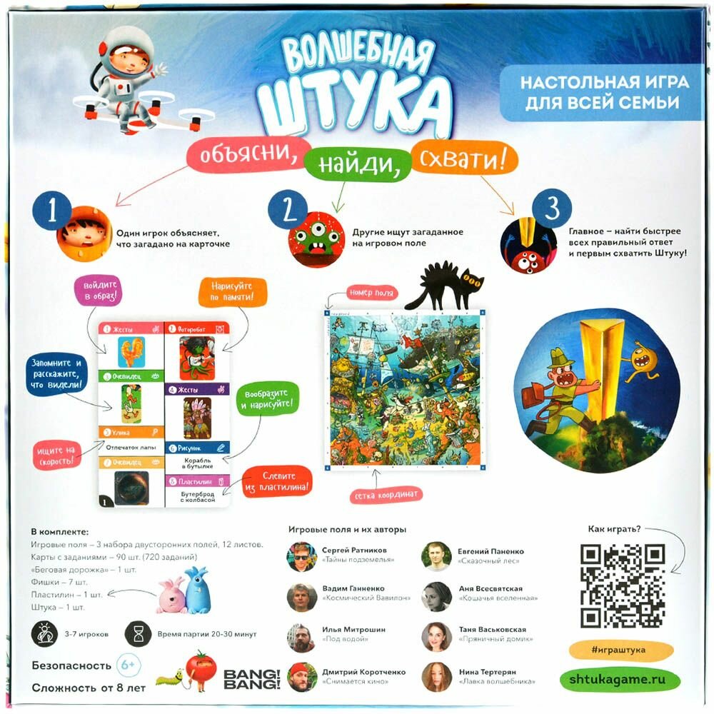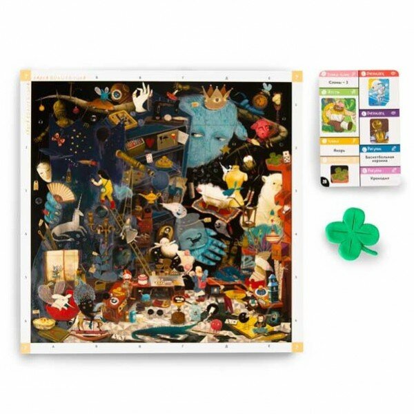 Семейная версия любимой игры с загадочными полями-картинами и золотой Штукой! 8 НОВЫХ волшебных миров, созданных современными художниками под руководством иллюстраторского агентства Bang! Bang! ЛЮБИМЫЕ сюжеты и персонажи. Юмор, понятный детям и взрослым. Обновленные способы объяснения: «Пластилин» – создаём скульптуры из пластилина, бумаги, зубочисток и всего, что будет под рукой. «Улика-блиц» – сразу несколько деталей притаились где-то на поле. Найди их все!Пластилин входит в набор.Потребуются принадлежности для рисования!