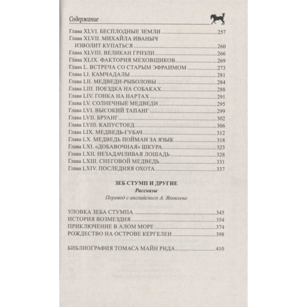 Новый том Майн Рида в серии "Мастера приключений" состоит из трех разделов. В первый включена авантюрная повесть плаща и шпаги "Письмо и пуля" - история совершенно самостоятельная, но хронологически примыкающая к романам "Без пощады!" и "Белая перчатка". Во второй раздел входит роман "Охотники на медведей" - кругосветная эскапада в духе еще не написанных книг Жюля Верна. Главные герои романа - совсем молодые русские аристократы-путешественники и их верный слуга, отставной унтер-офицер Пушкин. Третий раздел состоит из довольно редких рассказов, многие из которых никогда не публиковались в книжном формате даже на языке оригинала. В одной из этих "потерянных историй" вас ждет новая встреча с неунывающим балагуром-охотником Зебом Стумпом, известным каждому почитателю Майн Рида по лихому вестерну "Всадник без головы". Роман "Охотники на медведей" публикуется в отредактированном и основательно дополненном переводе, с включением фрагментов и целых глав, которые были сокращены в предыдущих русских изданиях. Повесть и все рассказы на русском языке публикуются впервые.