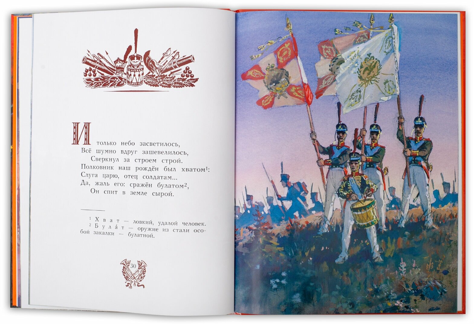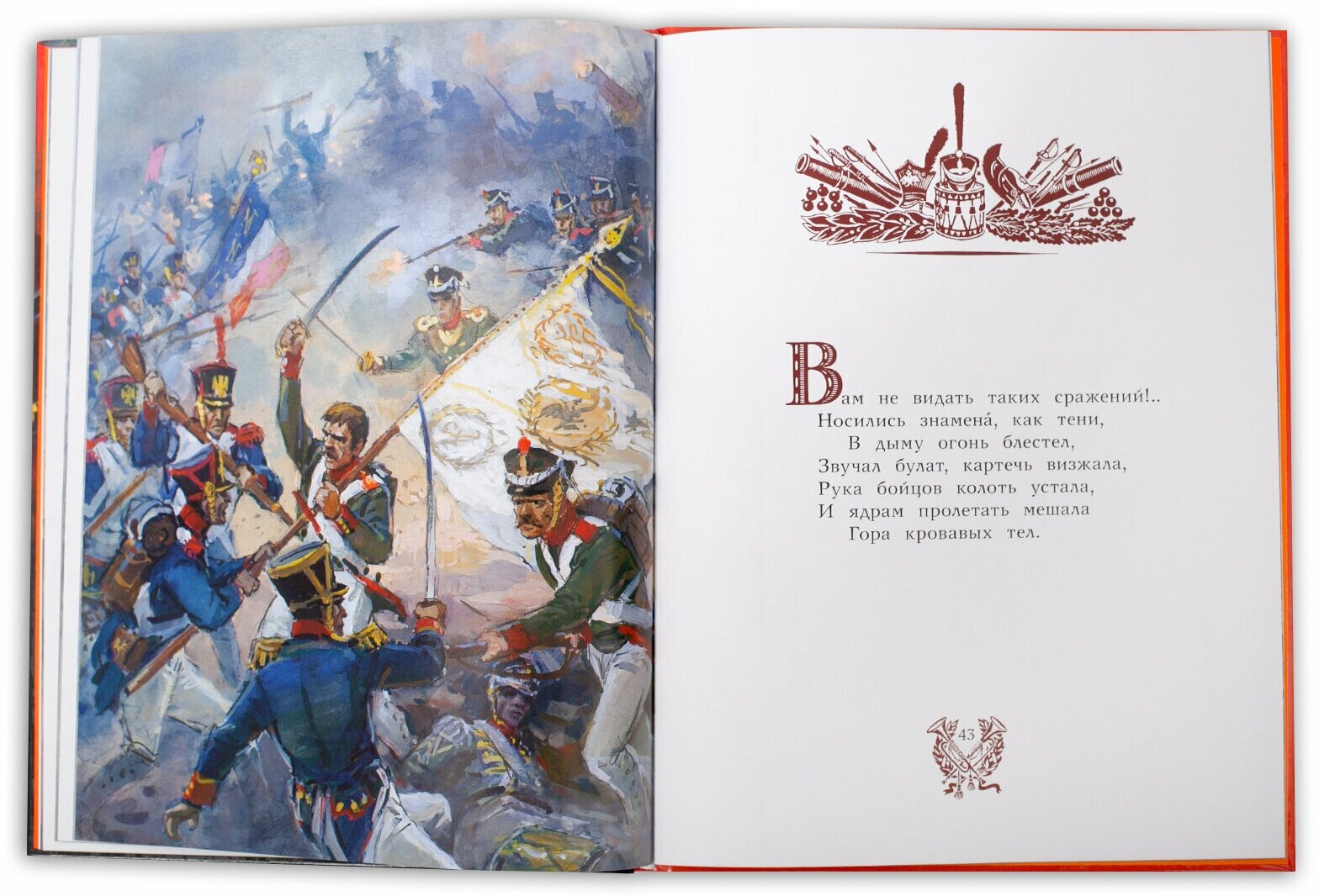 Известное стихотворение Михаила Юрьевича Лермонтова о знаменитом сражении Отечественной войны 1812 года с иллюстрациями выдающегося художника Владимира Гавриловича Шевченко, который сумел передать масштаб битвы, изобразить исторически верное расположение участников на Бородинском поле, соблюсти все детали вооружения, амуниции и обмундирования войск.
