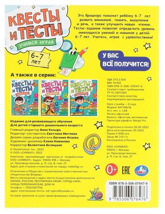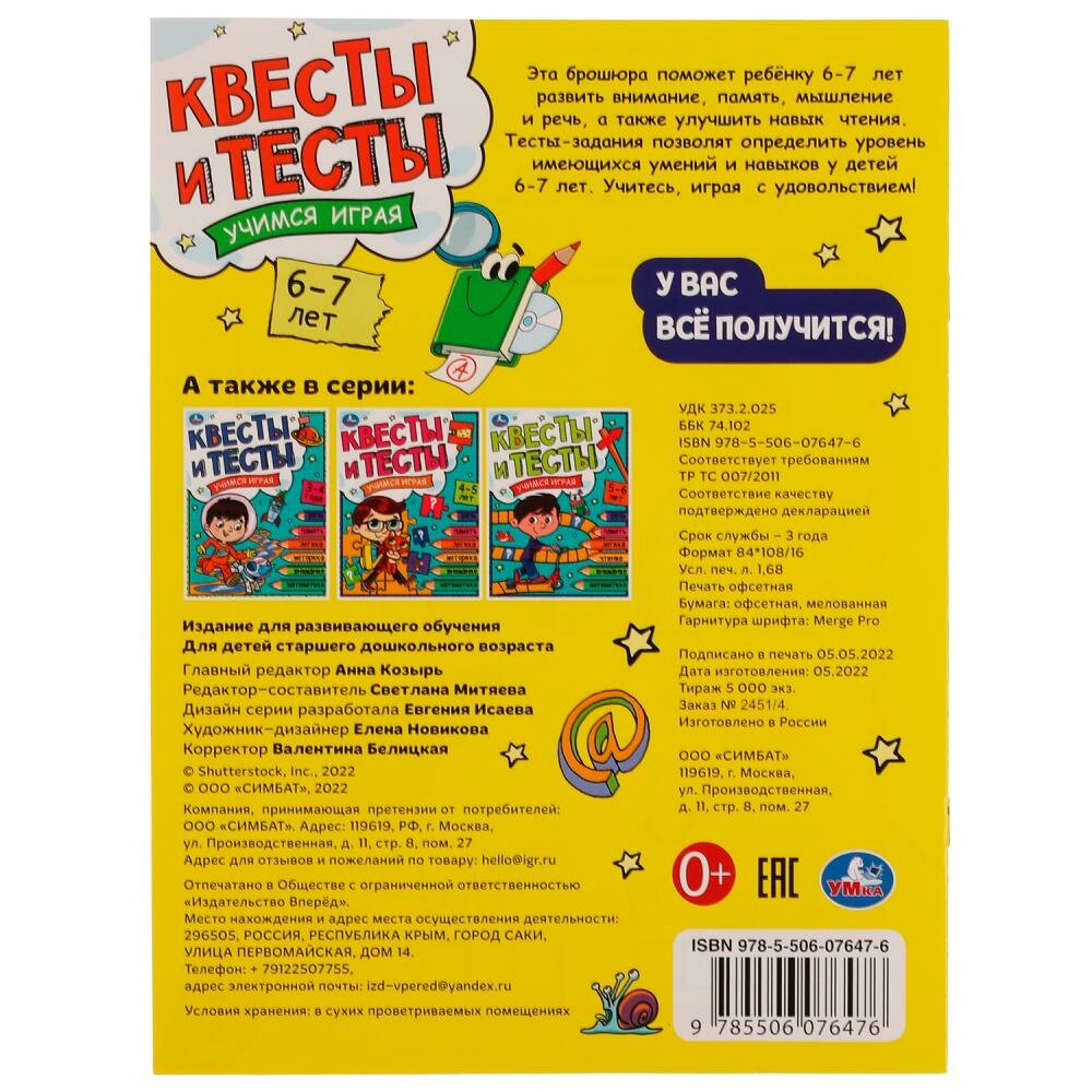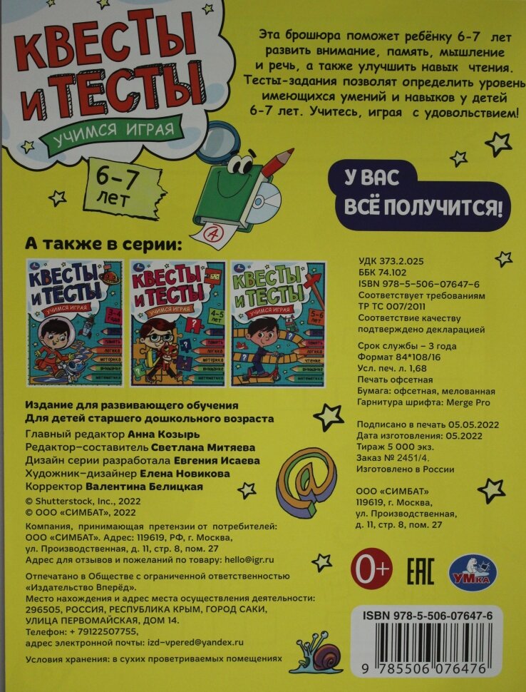 Сервис сравнения цен СкидкаГИД предлагает сравнить цены на товар «Книга: Книга Квесты и тесты 6-7 лет. Учимся играя. Жукова И.С. (Митяева С. -ред. -сост.), 2022»