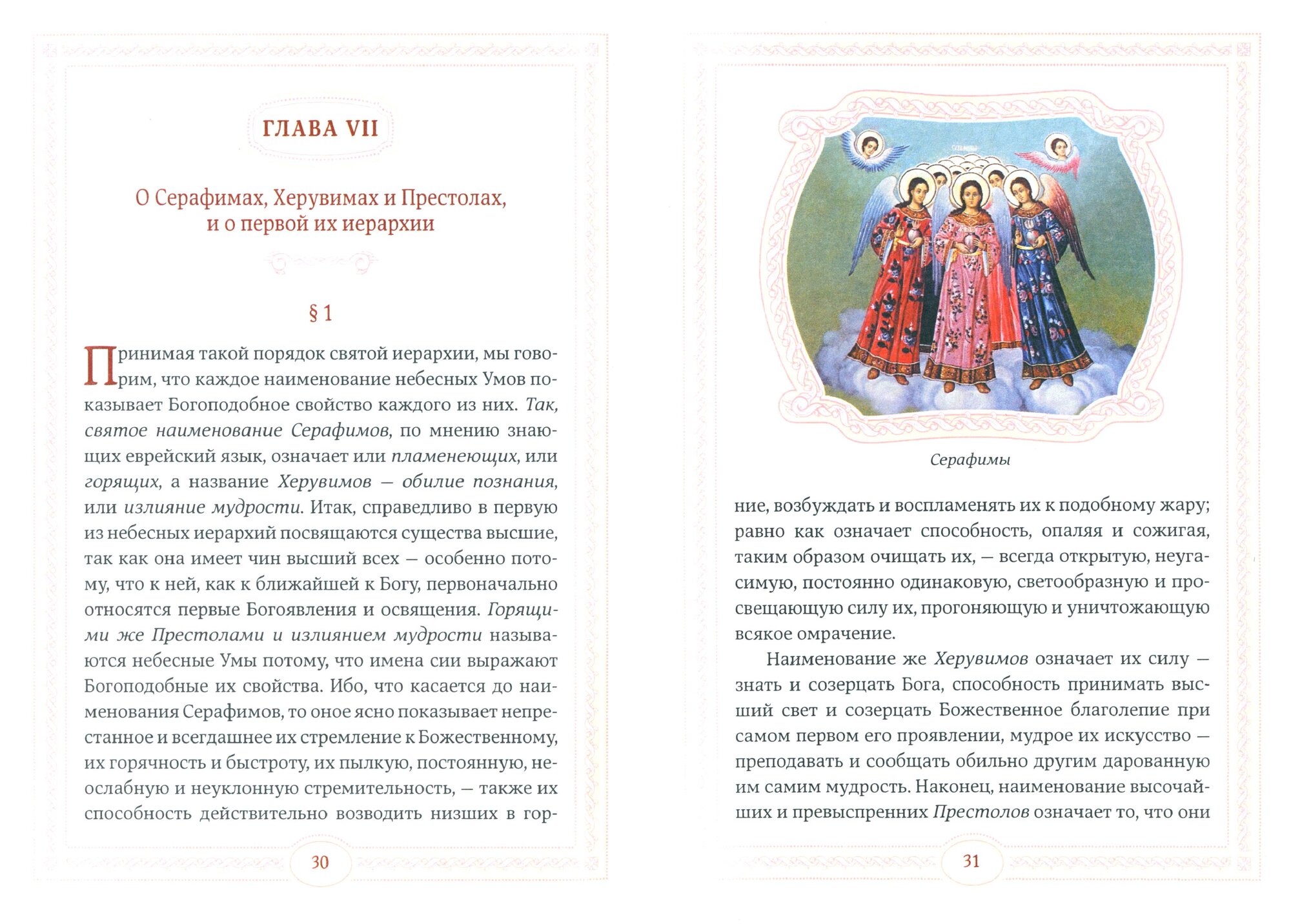 Книга представляет собой систематическое изложение учения об ангелах; в ней подробно рассматриваются девять чинов небесных умопостигаемых сущностей (ангелов): серафимы, херувимы, престолы, господства, силы, власти, начальства, архангелы и ангелы, — каждый из которых сообщает свое знание Бога нижестоящему ангельскому чину. Данный труд опирается на свидетельства святых отцов Церкви об ангелах, в нем рассмотрены вопросы сотворения и бытия ангелов, их природы и существа, местопребывания и служения, и блаженная их вечность.