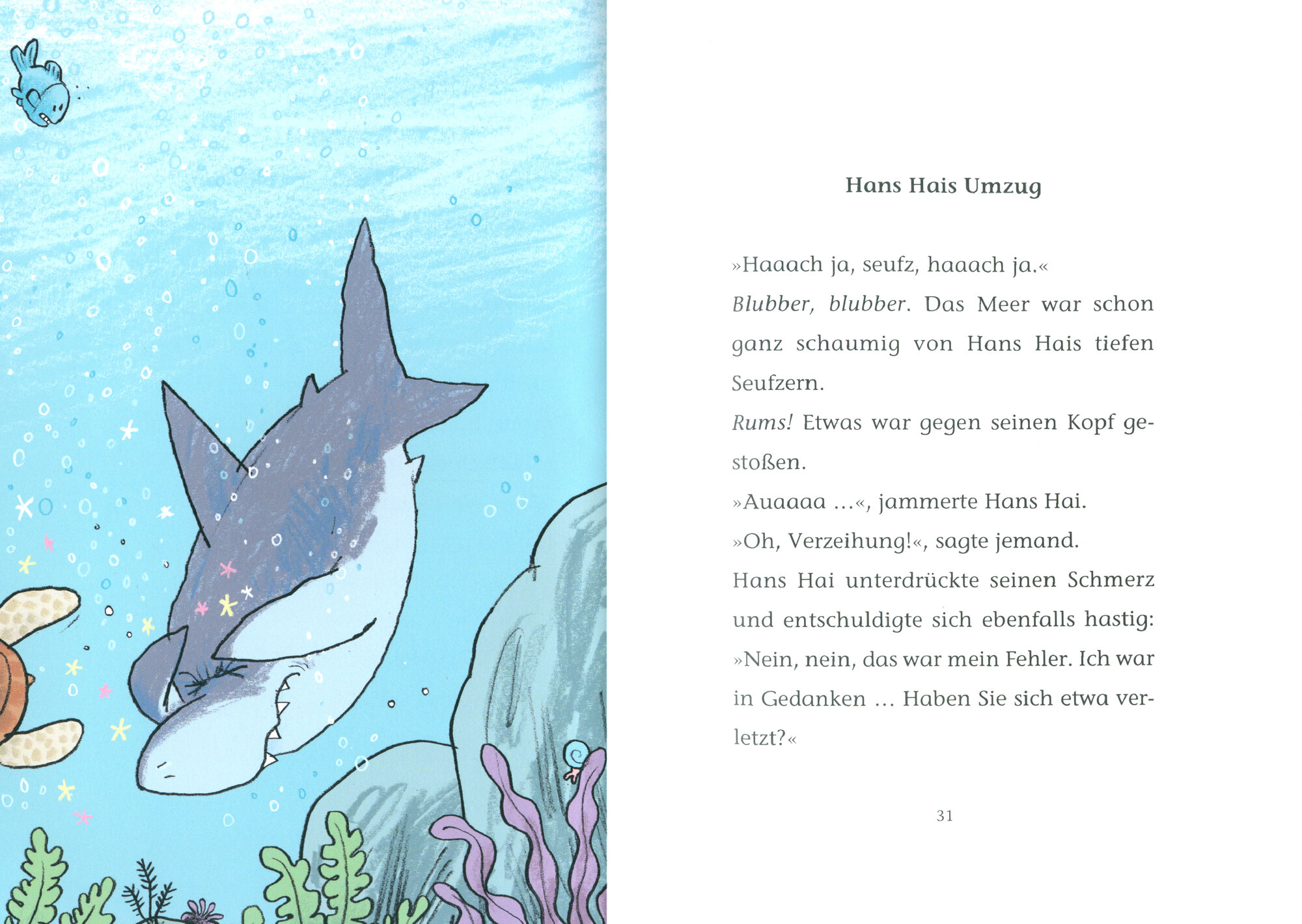 Einen Seufzer nach dem anderen sto?t Hans, der schuchterne Hai aus. Niemand will mit ihm zu tun haben, weil er so gruselig aussieht. Sicher wird er auch keine Antwort auf seinen Brief bekommen, den er an Puck im Algenwaldchen geschrieben hat. Vor lauter Aufregung hatte er namlich vergessen, seinen Absender auf den Brief zu schreiben. Wie soll die Antwort von Puck ihn so erreichen? Da kommt Postbotin Robbe ins Spiel. Geht nicht, gibt es bei ihr nicht…