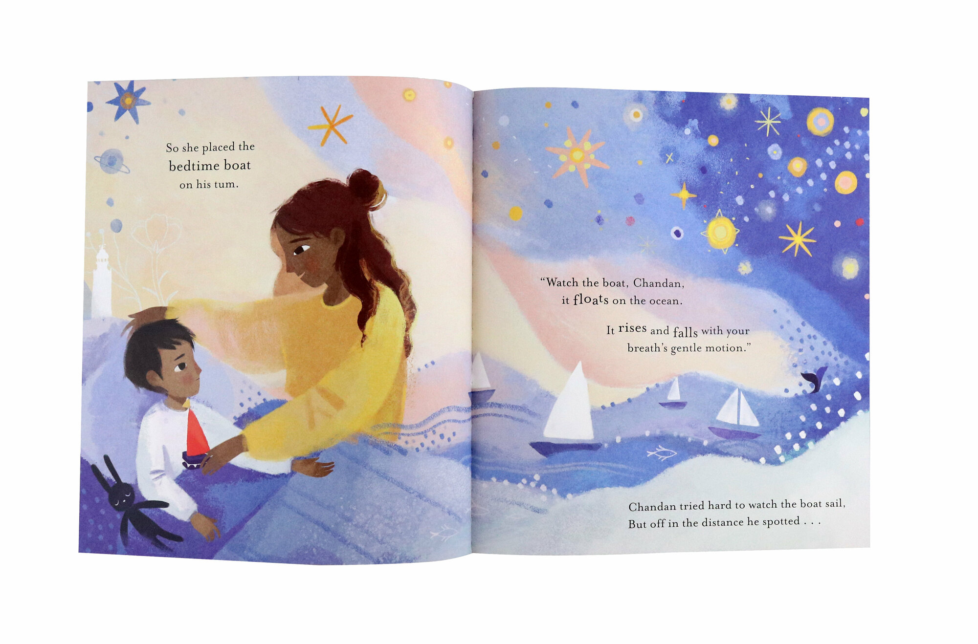 Luckily, his mum has some calming mindfulness techniqueS at her fingertips. The bedtime boat sits on Chandan’s tummy, rising and falling with his breath. As he travels on a voyage of imagination over the seas, the bedtime boat is always there to keep him grounded, and soon gently lulls him into a relaxed and peaceful sleep.