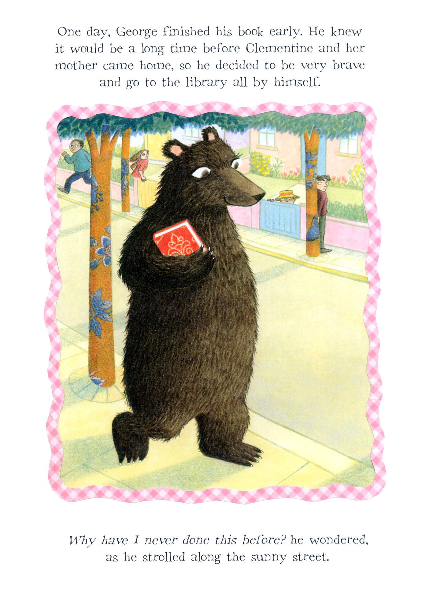 One day, when George finishes his book early and knows it will be a long time before Clementine and her mother return home, he decides to go the library by himself. At first it’s exciting to stroll along the sunny street. But poor George’s trip soon ends in disaster and, to make things worse, his library book is ruined. Can anyone help George to feel better when his feelings are hurt?