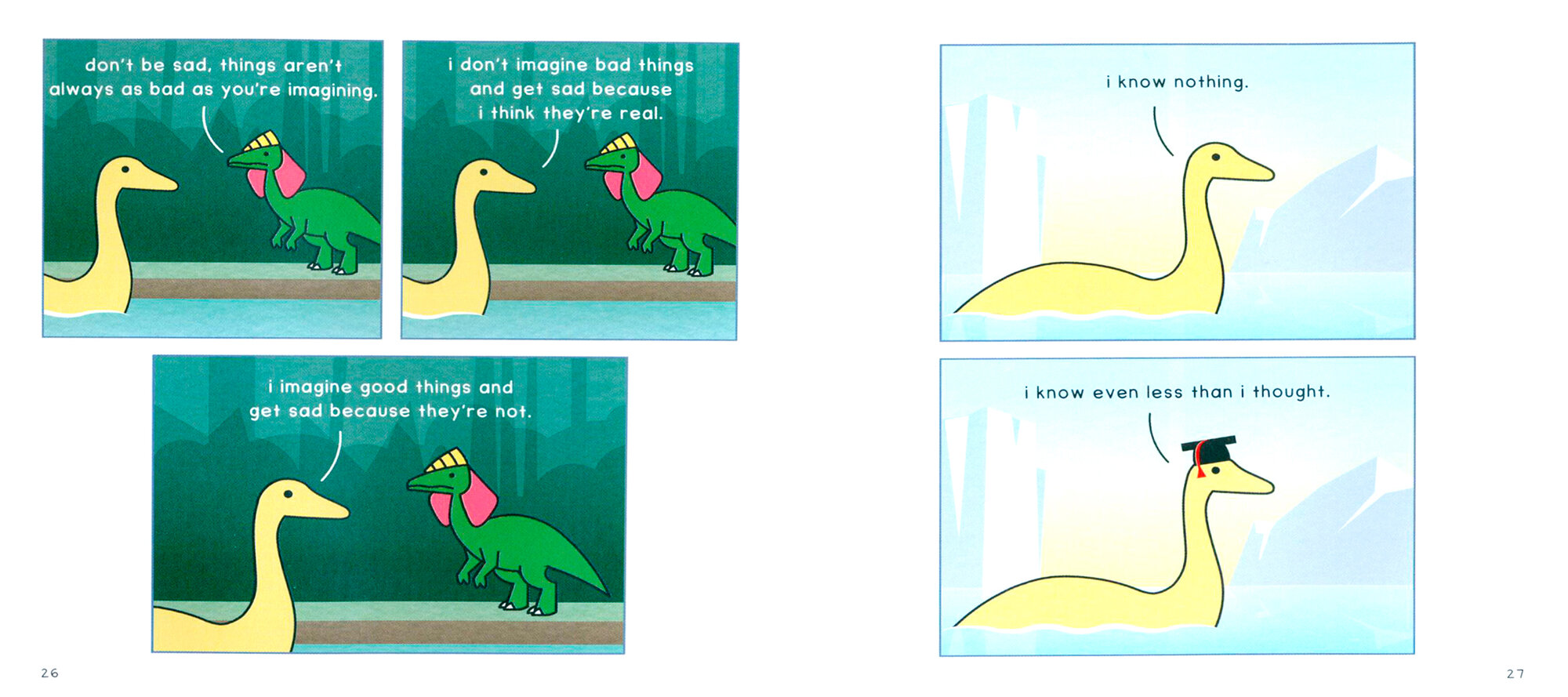 Posing questions such as 'do I exist?', 'how should I live?', 'what is beauty?' in each comic, dinosaur characters explore how to exist in the modern world and meditate on what it means to 'live well'.